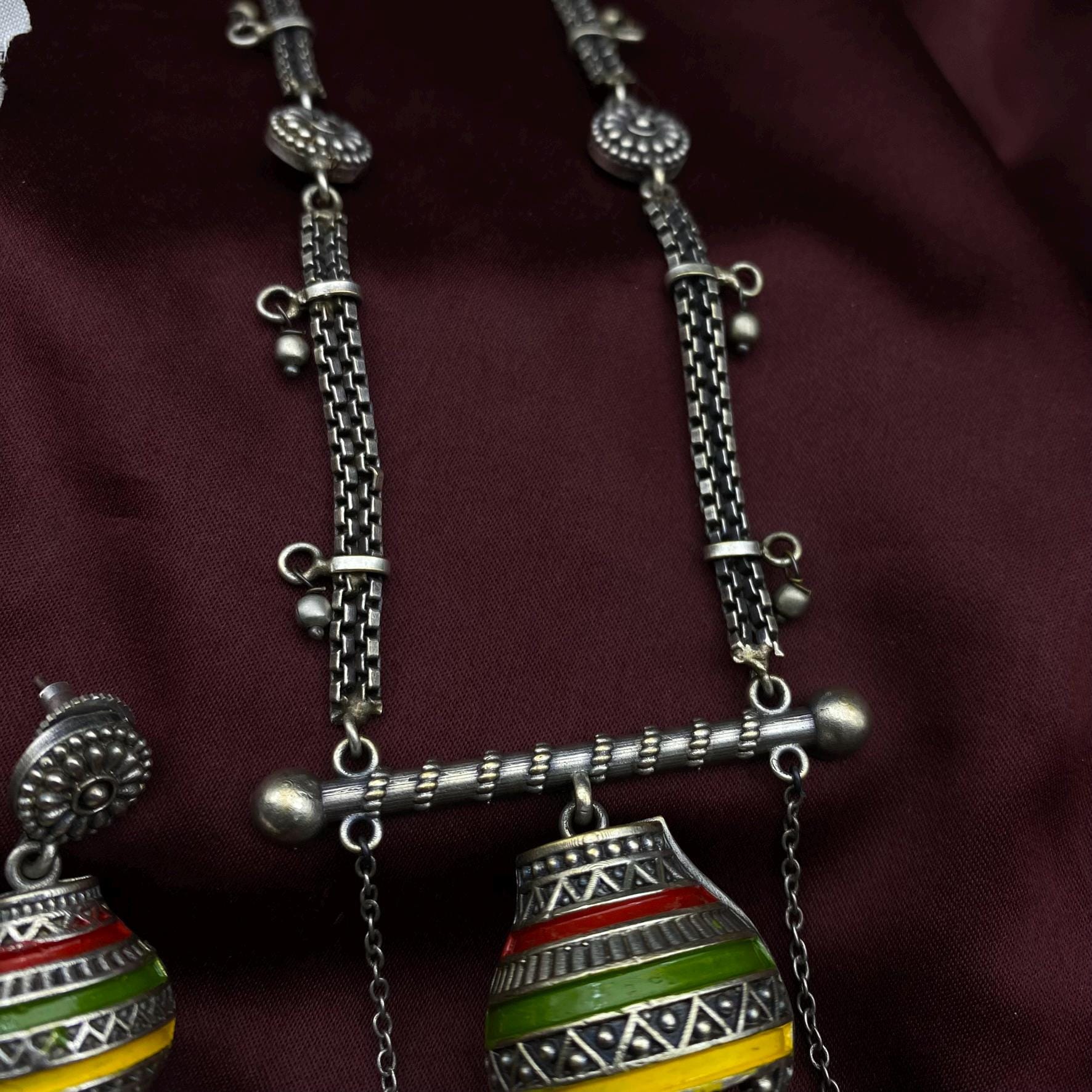 Step into bold tradition with this handcrafted oxidized silver necklace set by Quirky Fashions. Featuring a long tribal chain with intricate detailing and a statement pendant, this set includes matching earrings that showcase vibrant hand-painted enamel beads in red, green, yellow, and black. The design draws inspiration from traditional Indian craftsmanship, reimagined with a boho twist for today’s free-spirited souls.