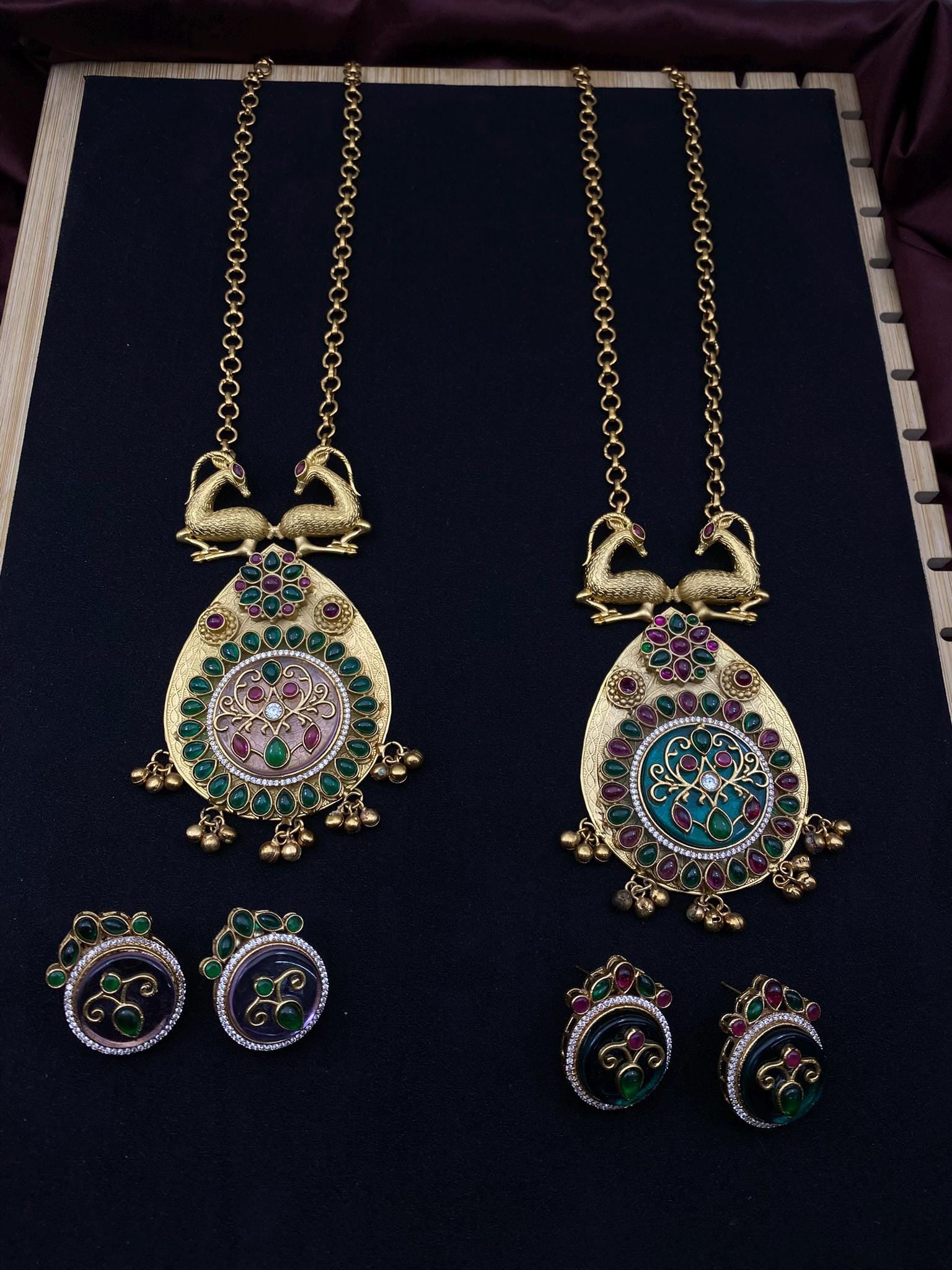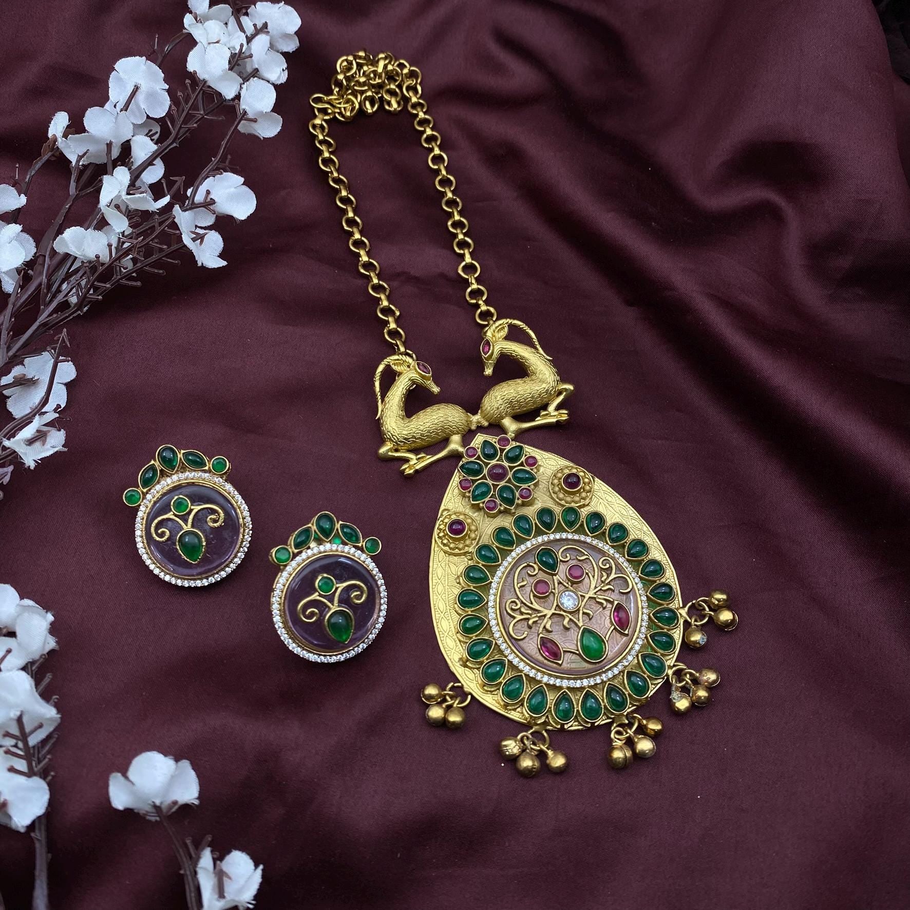 Celebrate tradition with this handcrafted South Indian temple necklace set featuring an intricate double-deer motif atop a bold teardrop pendant. Available in two elegant color variations – green-pink and deep emerald – this set is adorned with sparkling stones, golden finish, and delicate bead hangings. Each set includes a matching pair of detailed stud earrings for a complete festive or bridal look.