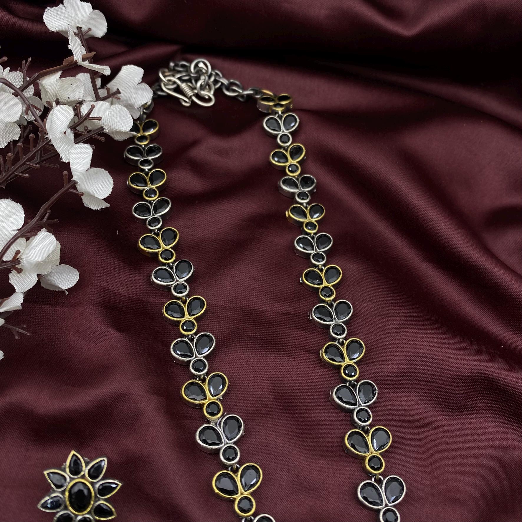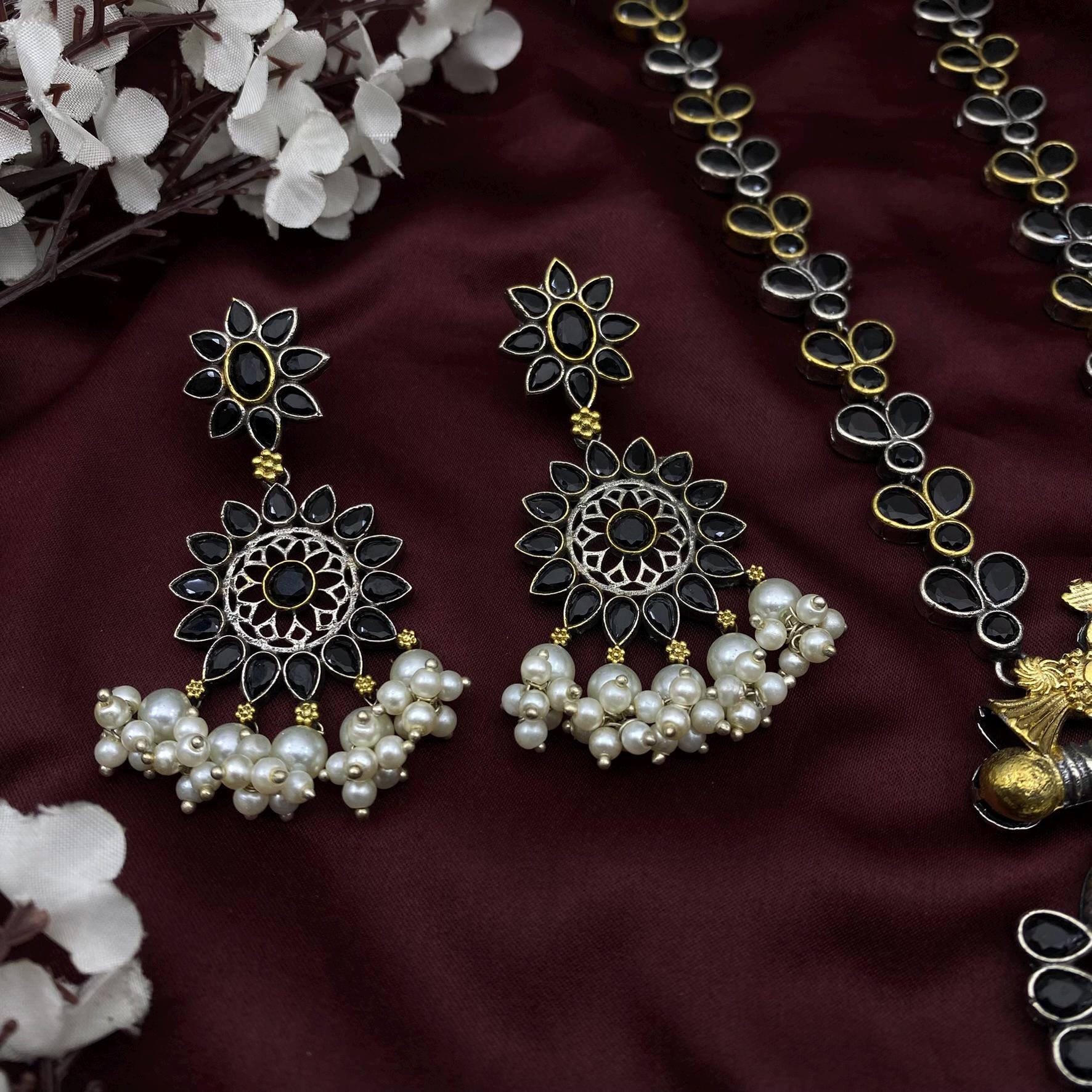 Make a bold statement with this handcrafted tribal oxidized necklace set by Quirky Fashions, featuring a striking black and gold floral design with intricate detailing, pearl drop accents, and a traditional ethnic flair. The set includes matching dangle earrings and a long patterned chain, perfect for festive, boho, or wedding wear.