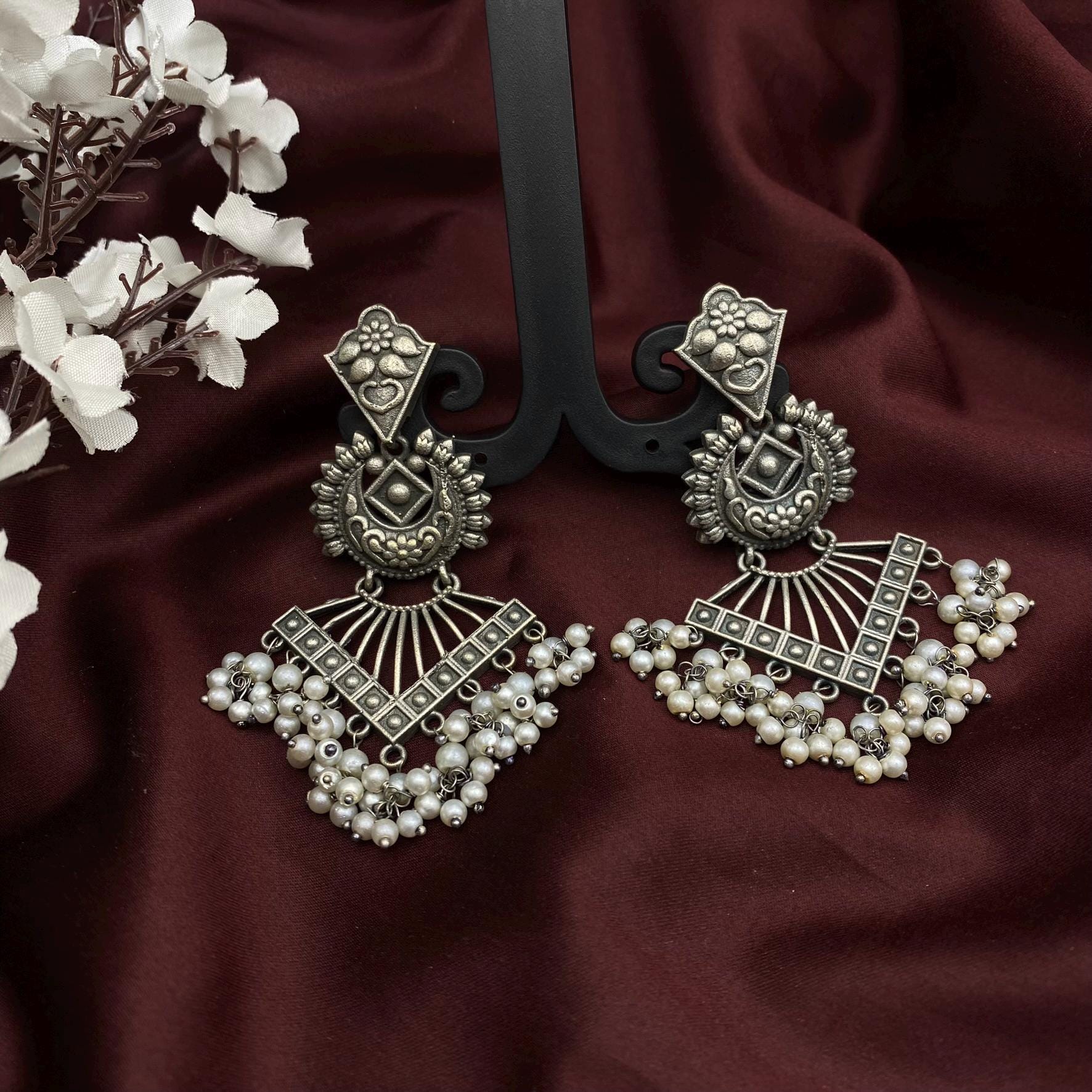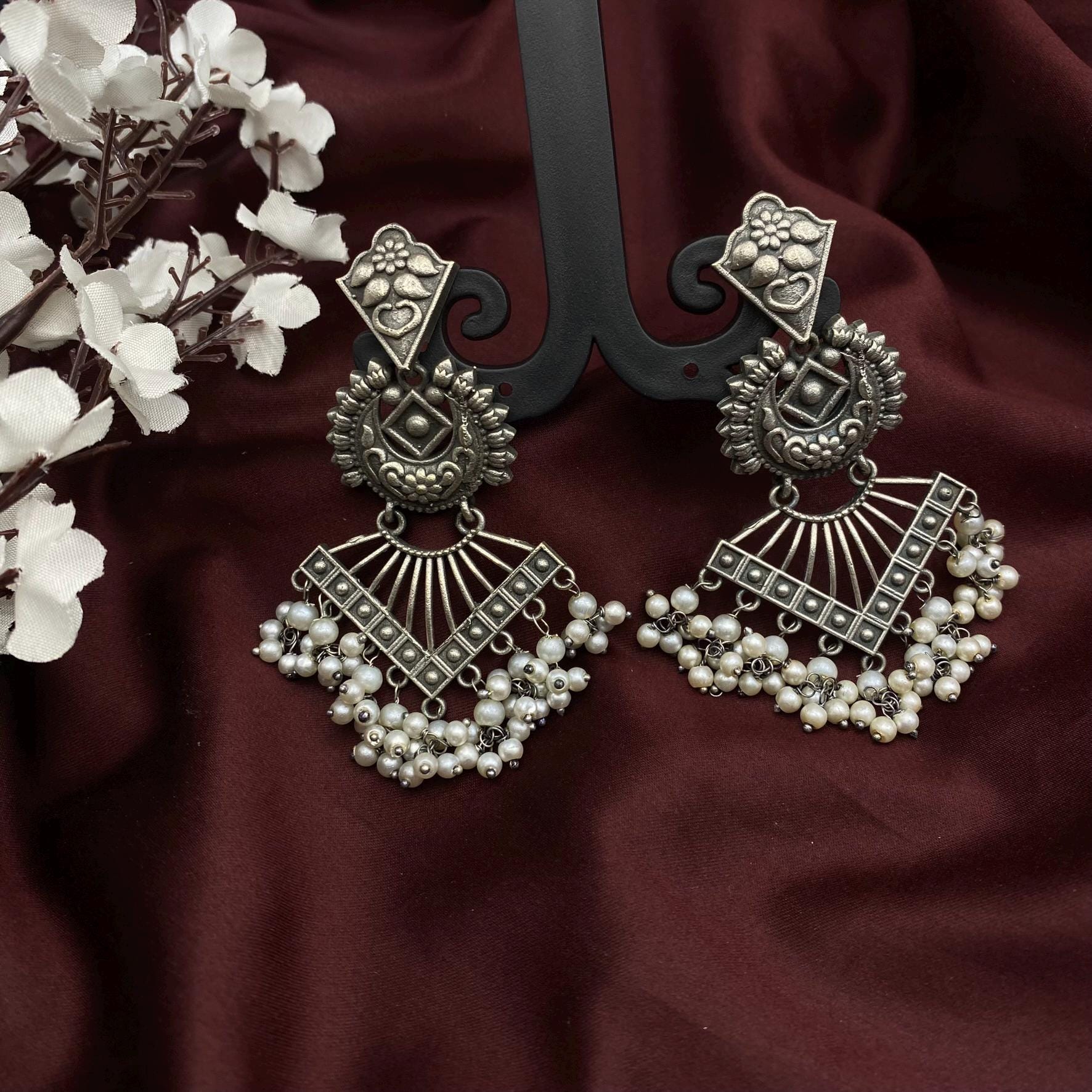 Handmade Oxidized Silver Chandelier Earrings with Pearl Danglers by Quirky Fashions