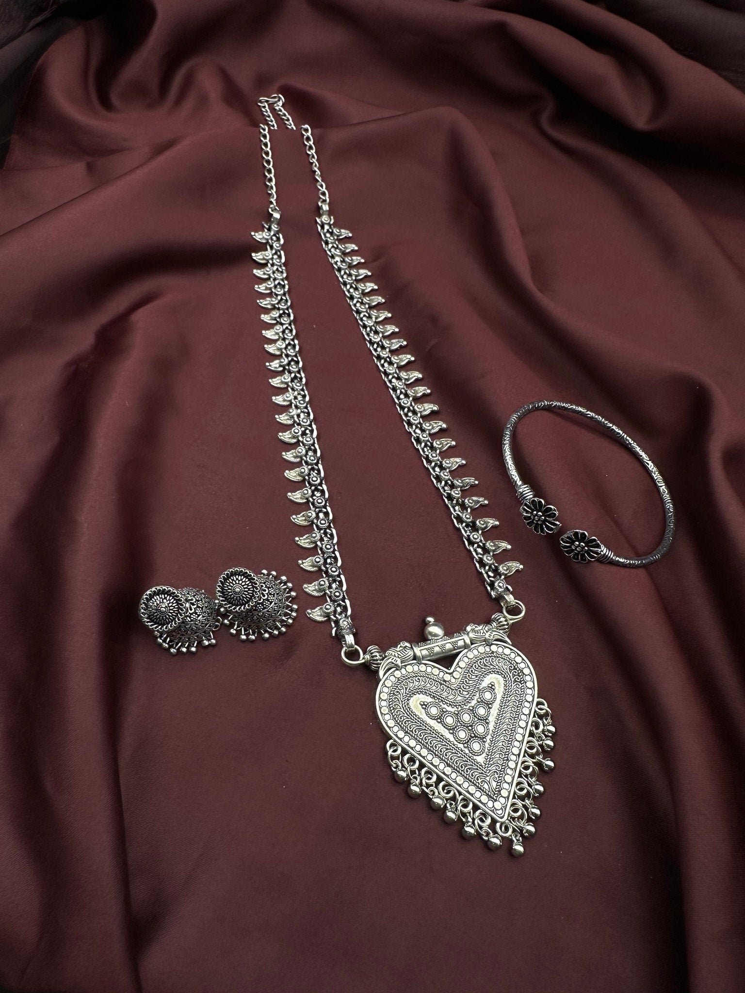 Indian Long Oxidised Jewelry Temple Jewelry with Jhumka Earrings & 1 pc German Silver Adjustable Kada Bangle