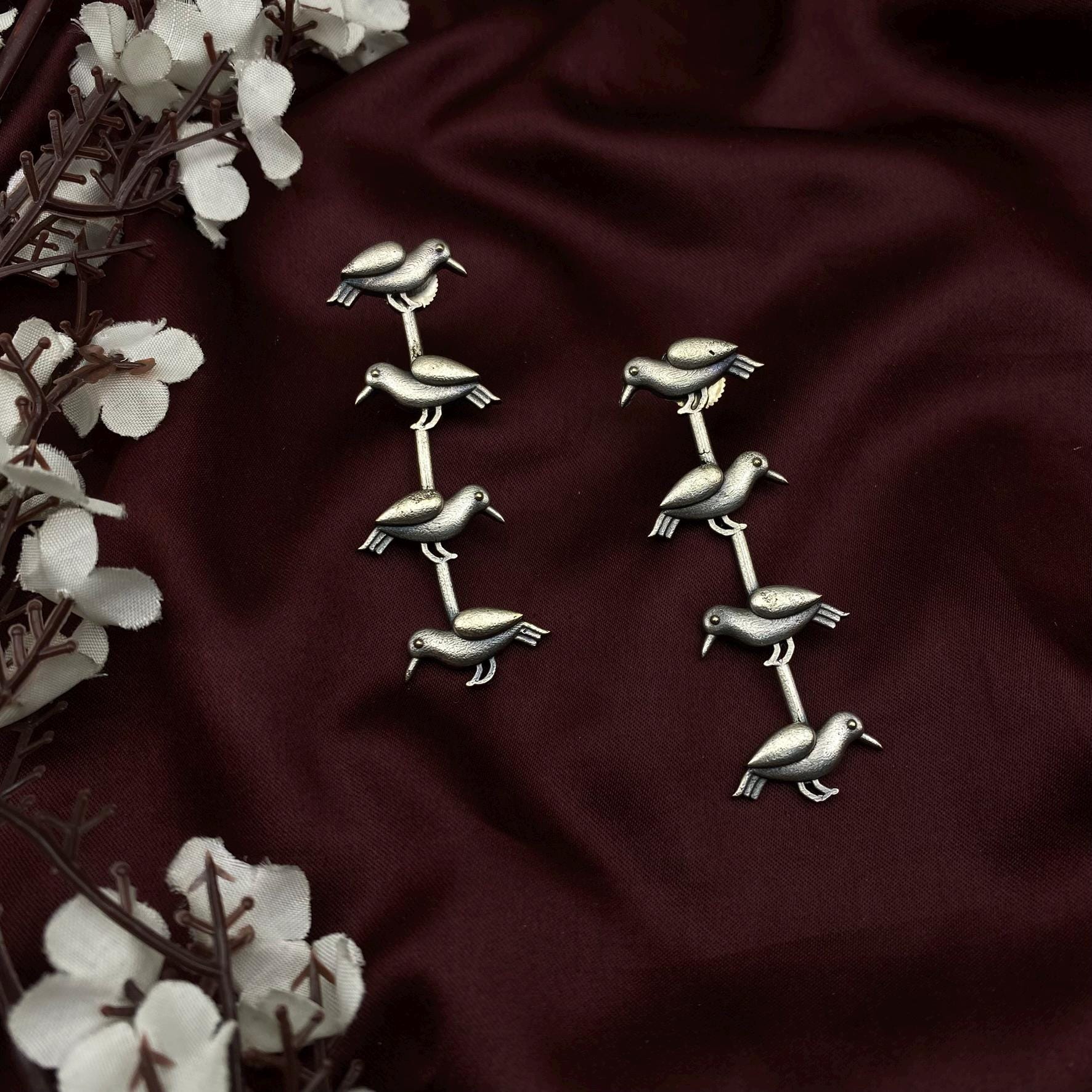Make a bold statement with these handcrafted oxidized silver dangle earrings featuring a unique row of perched birds. Designed for free-spirited souls, these long, lightweight earrings by Quirky Fashions add a whimsical charm to both ethnic and boho outfits. Perfect for gifting or elevating your everyday look with artistic flair.