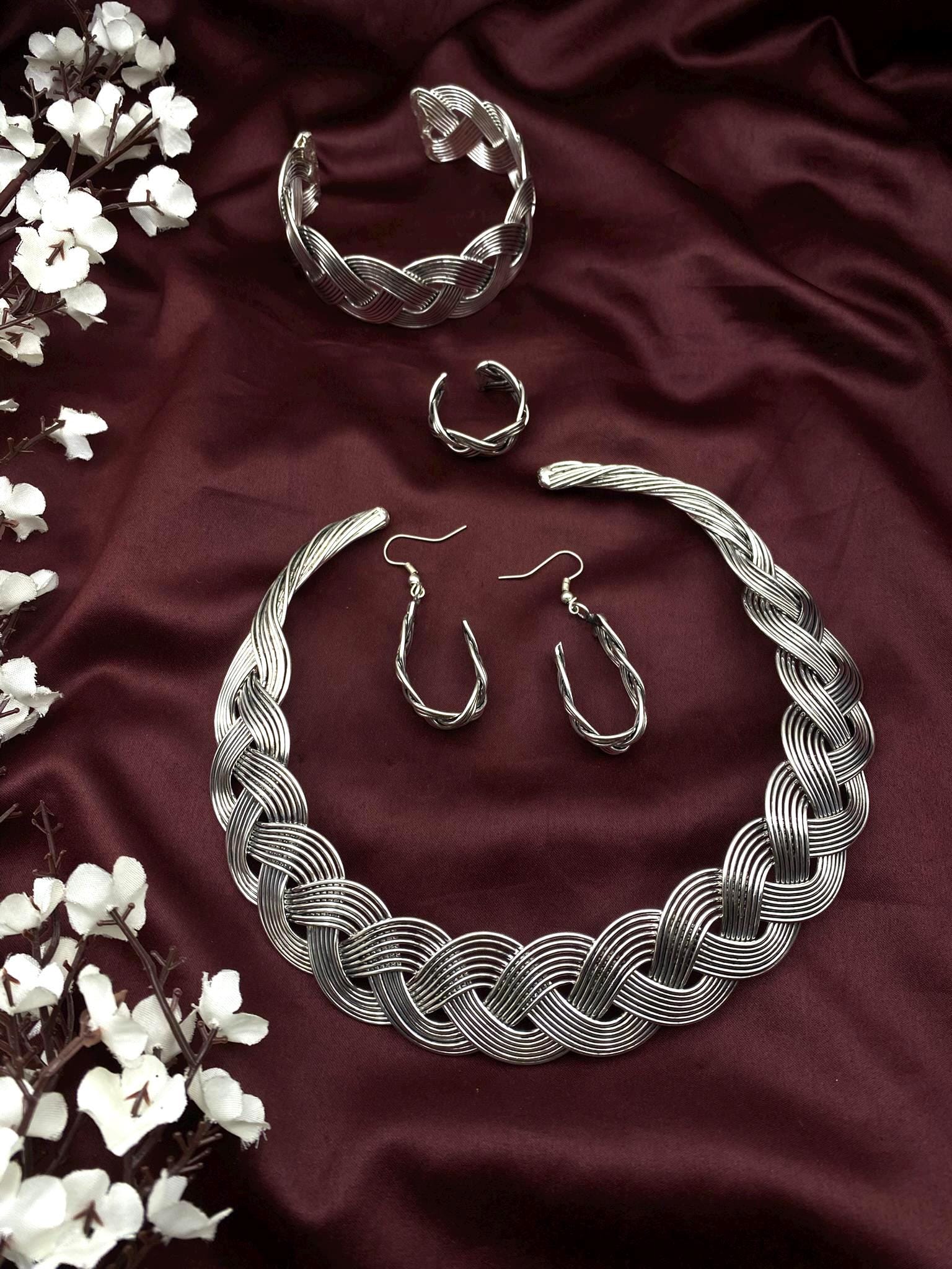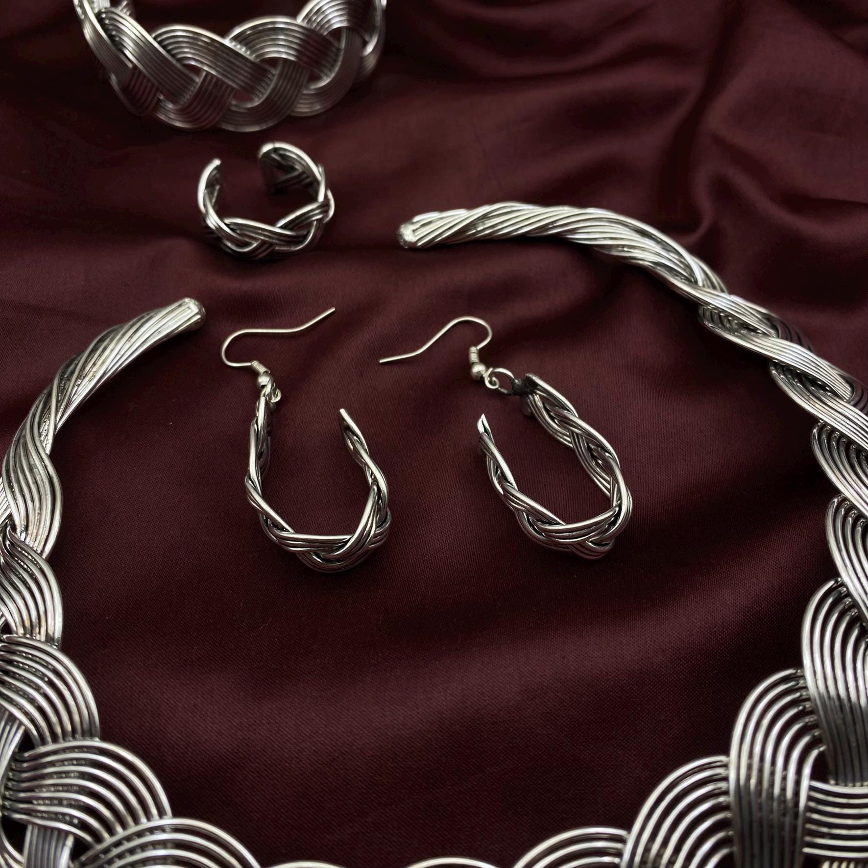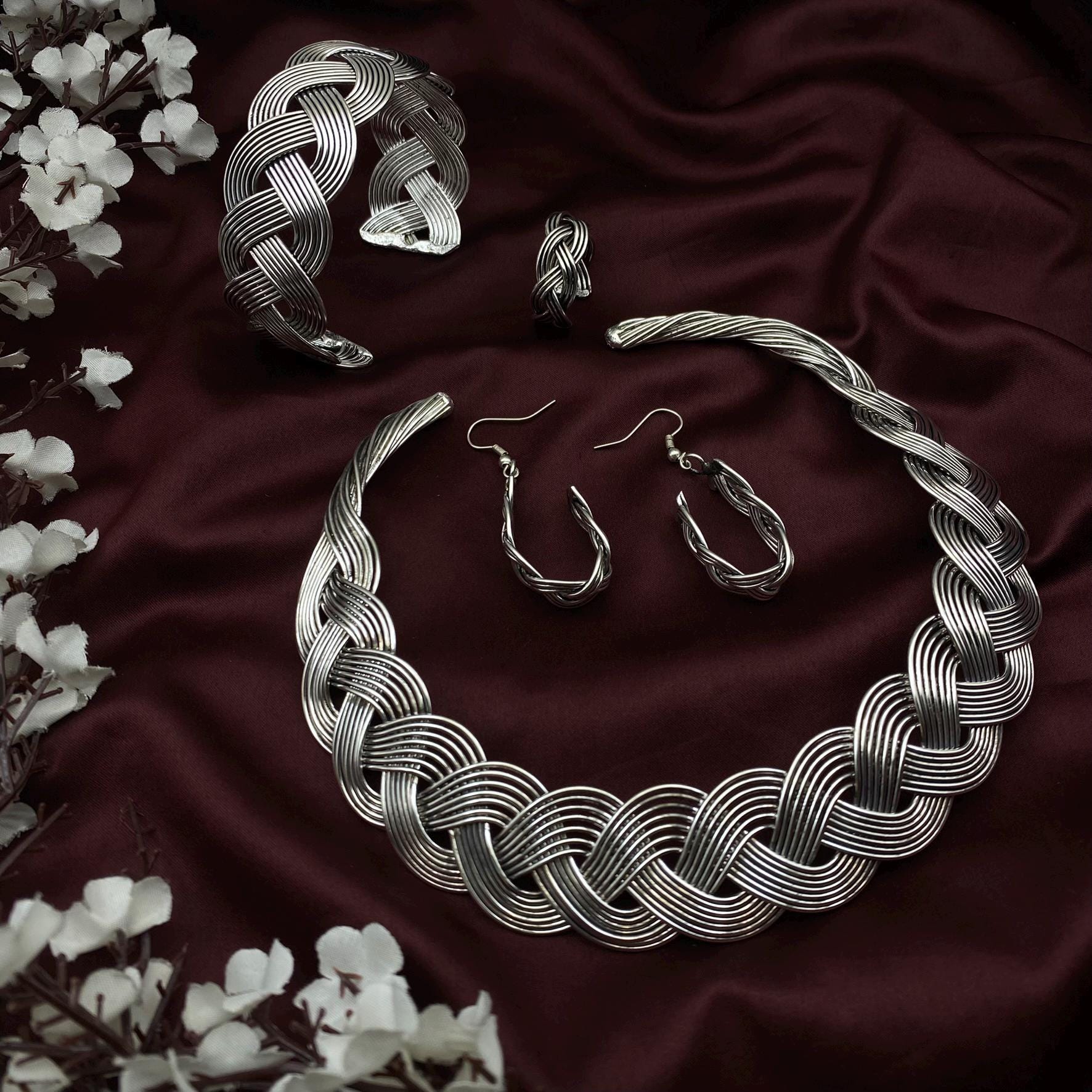 Oxidized Silver Braided Jewelry Set – Statement Necklace, Cuff Bracelet, Hoop Earrings & Ring | Boho Tribal Jewelry Set by Quirky Fashions