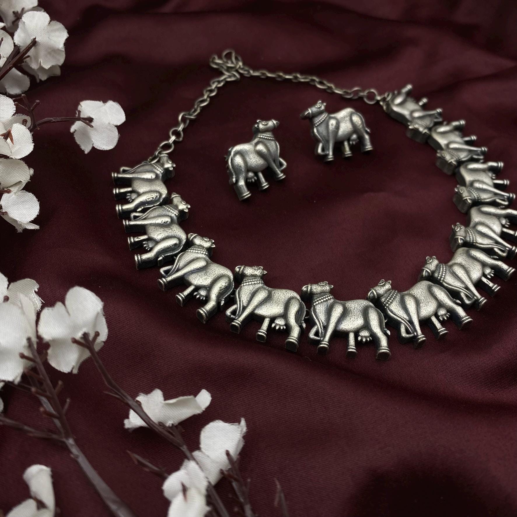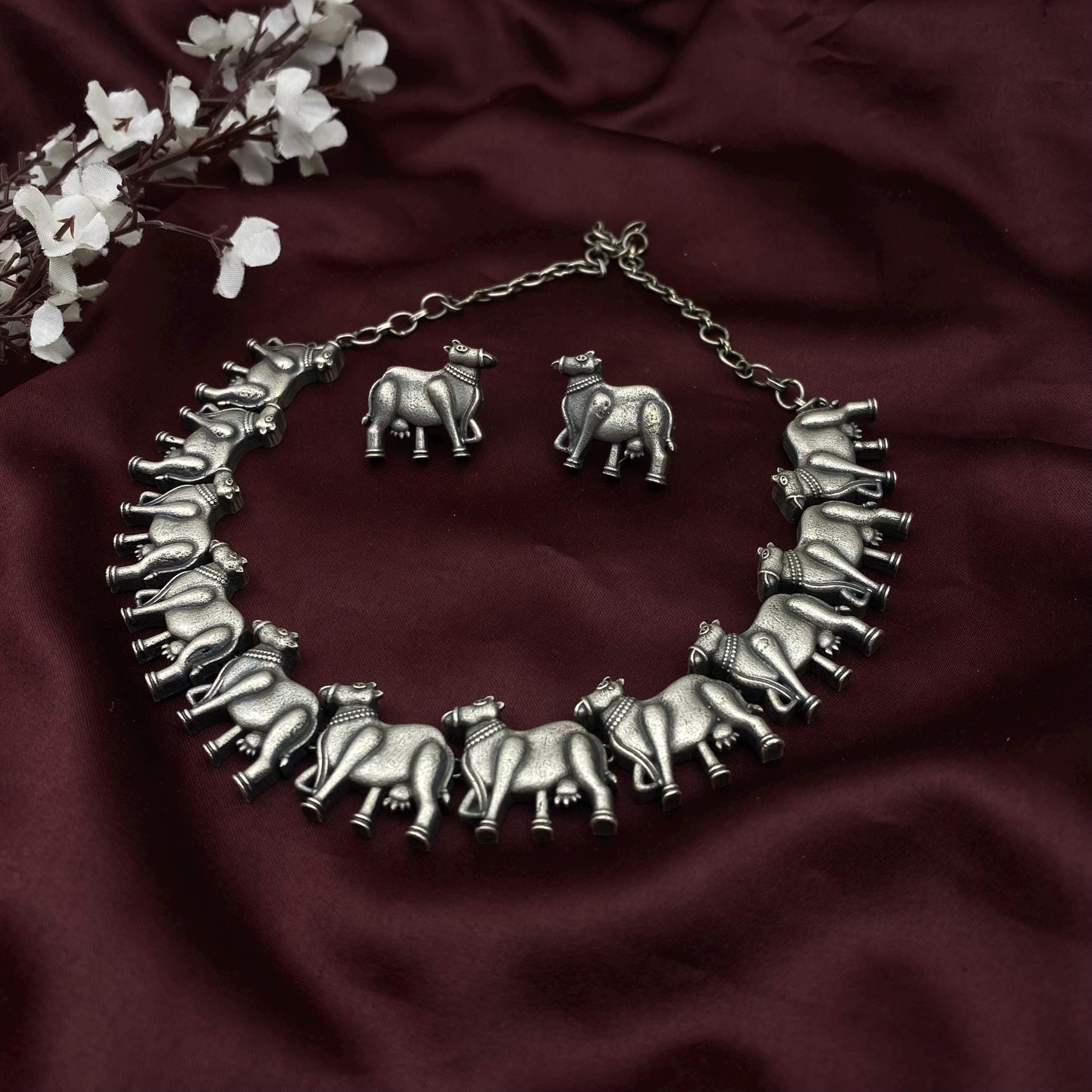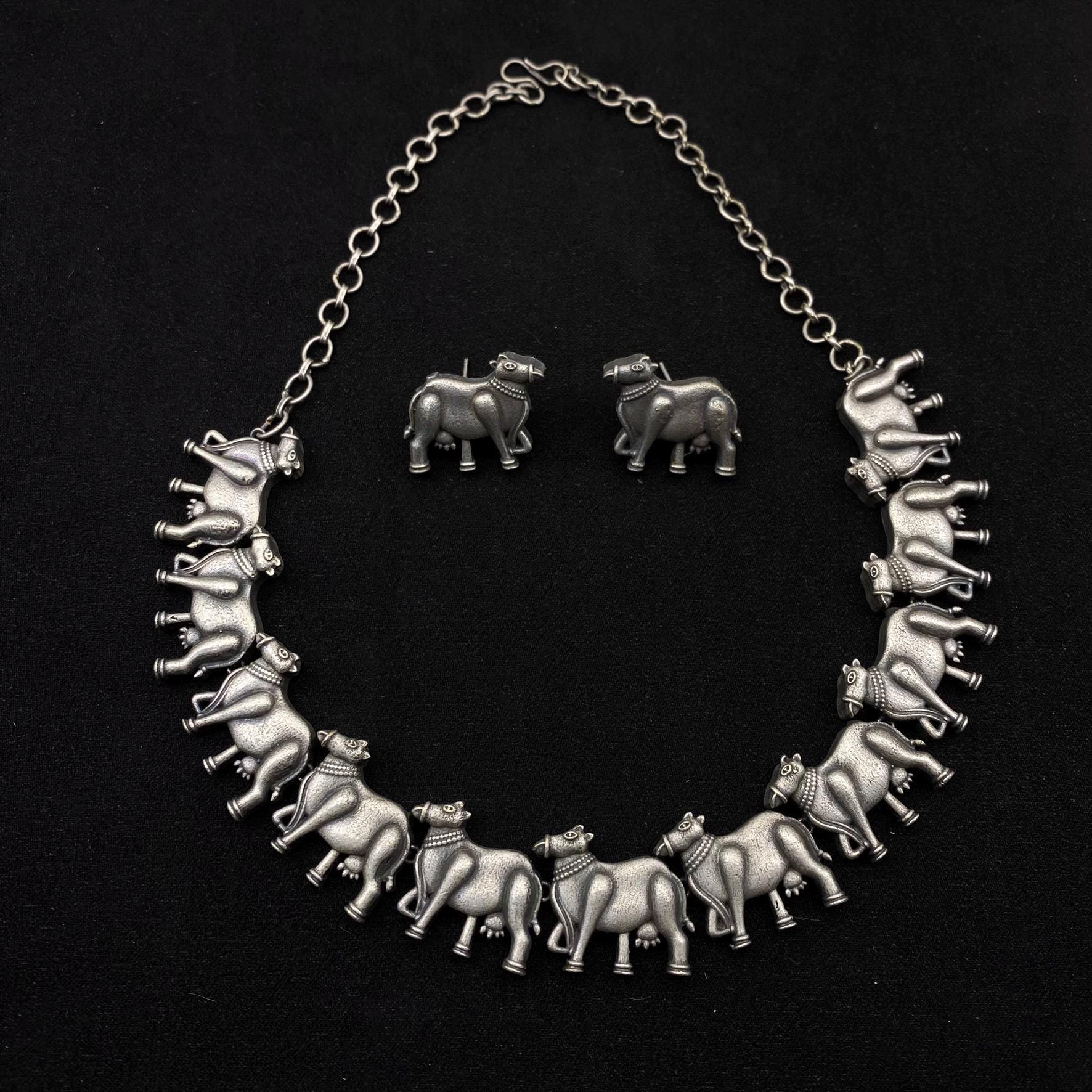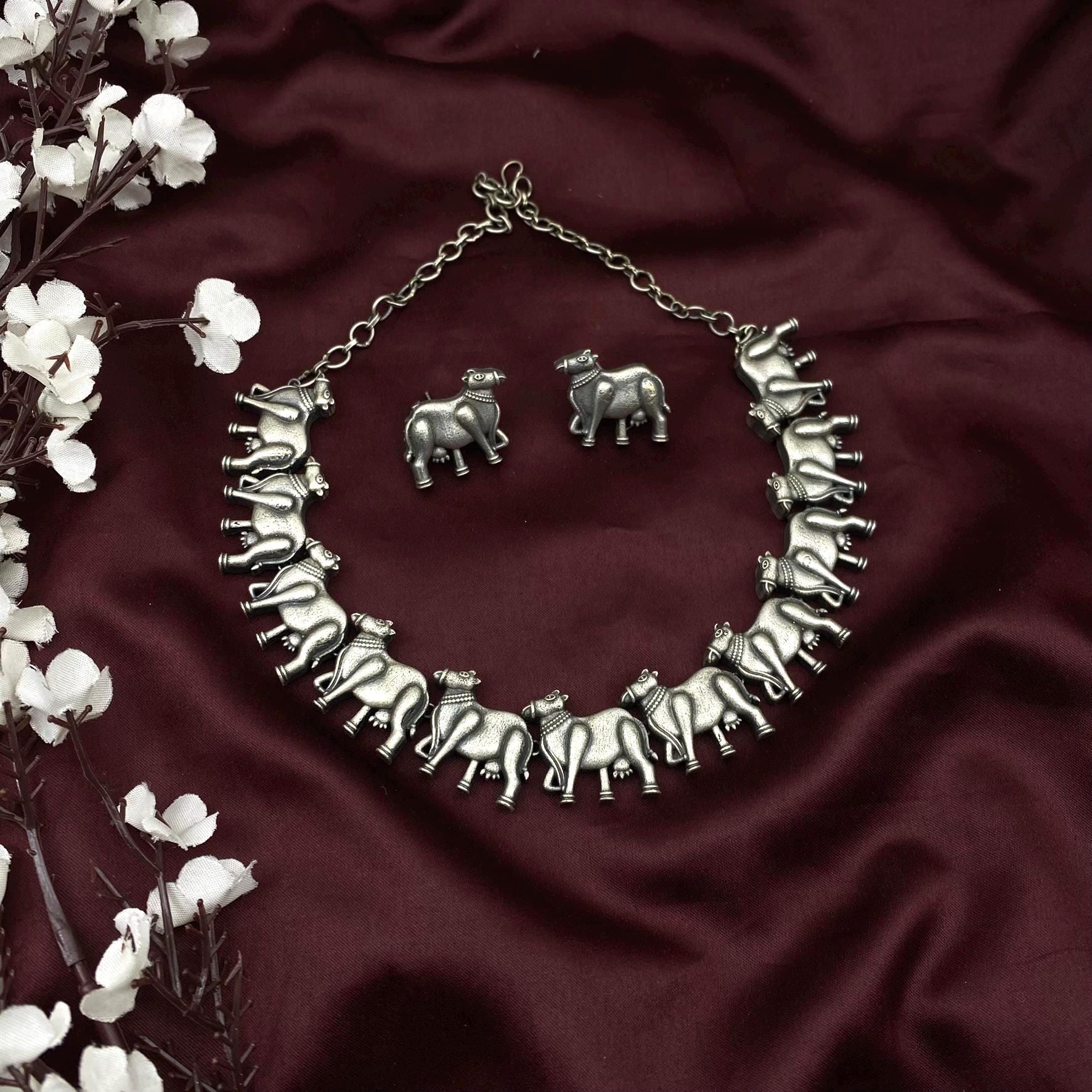 tribal necklace, animal motif jewelry, cow choker, quirky necklace, statement silver choker, boho ethnic jewelry, oxidized silver set, handmade Indian jewelry, folk art necklace, quirky fashions