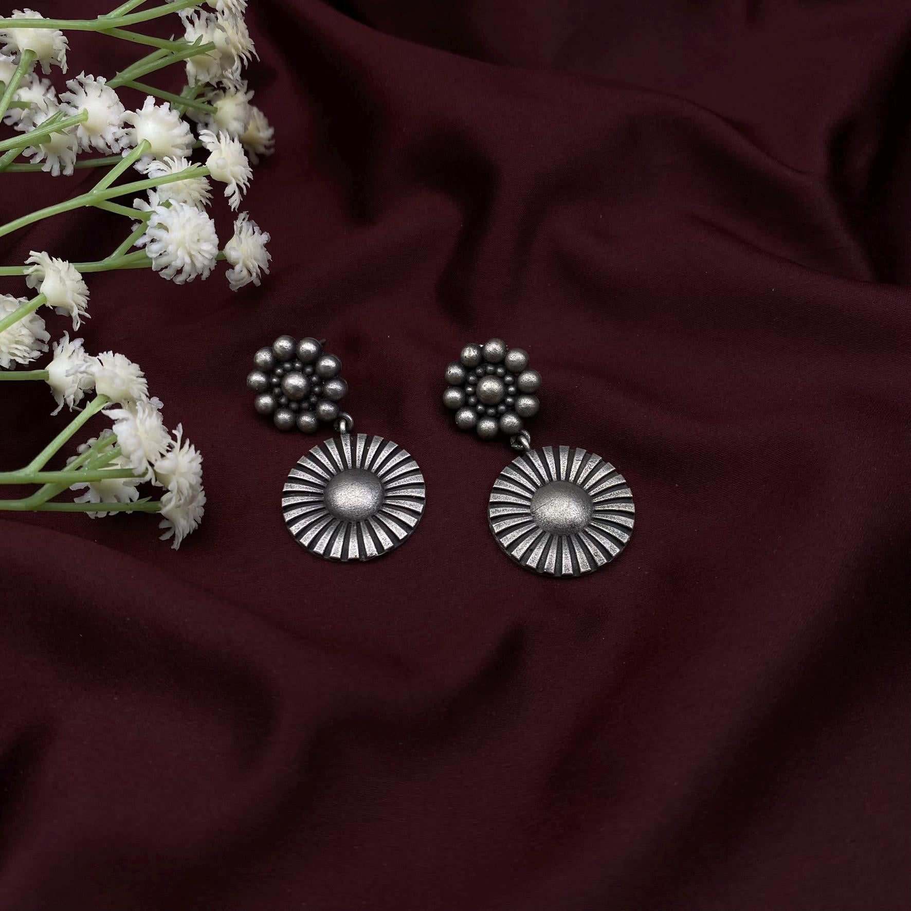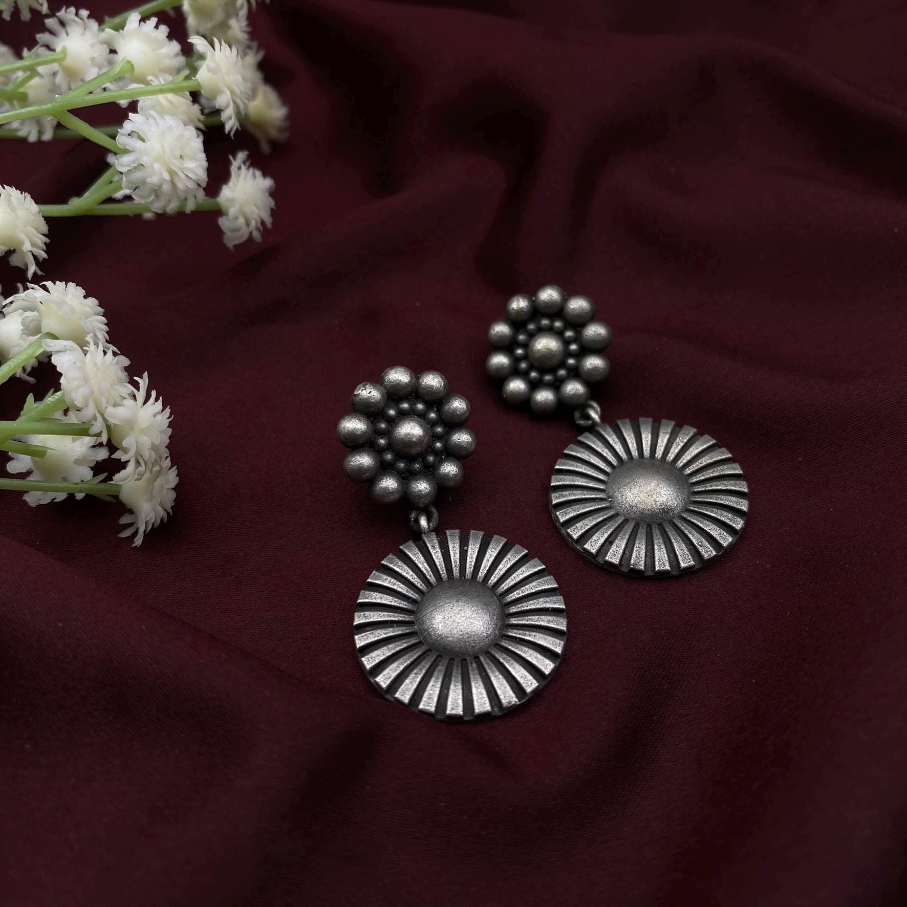 These stunning oxidized silver dangle earrings combine a bold vintage aesthetic with a timeless charm. The top stud features a floral design with raised bead-like detailing, adding texture and elegance. The lower charm boasts a sunburst-inspired design with a central raised dome, radiating intricate engraved lines that catch the light beautifully.