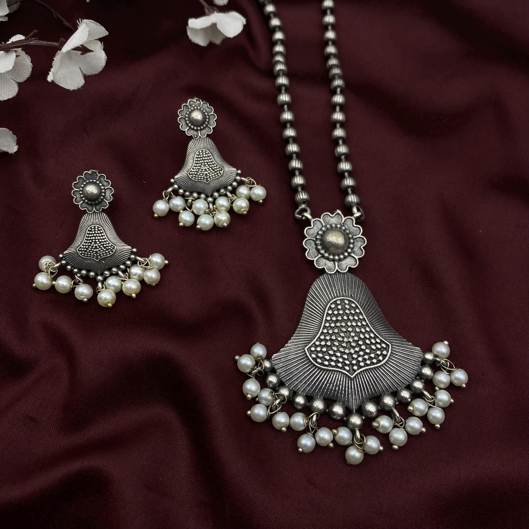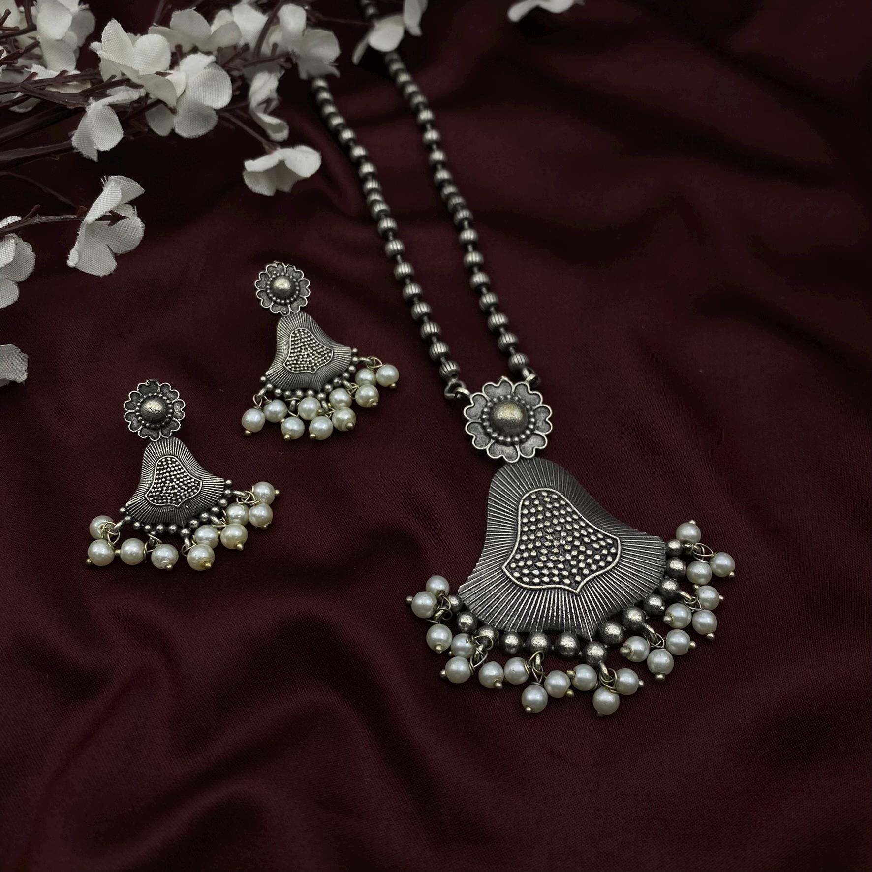 Oxidized Silver Long Necklace Set with Pearls | Tribal Pendant Jewelry with Earrings | Boho Statement Set by Quirky Fashions
