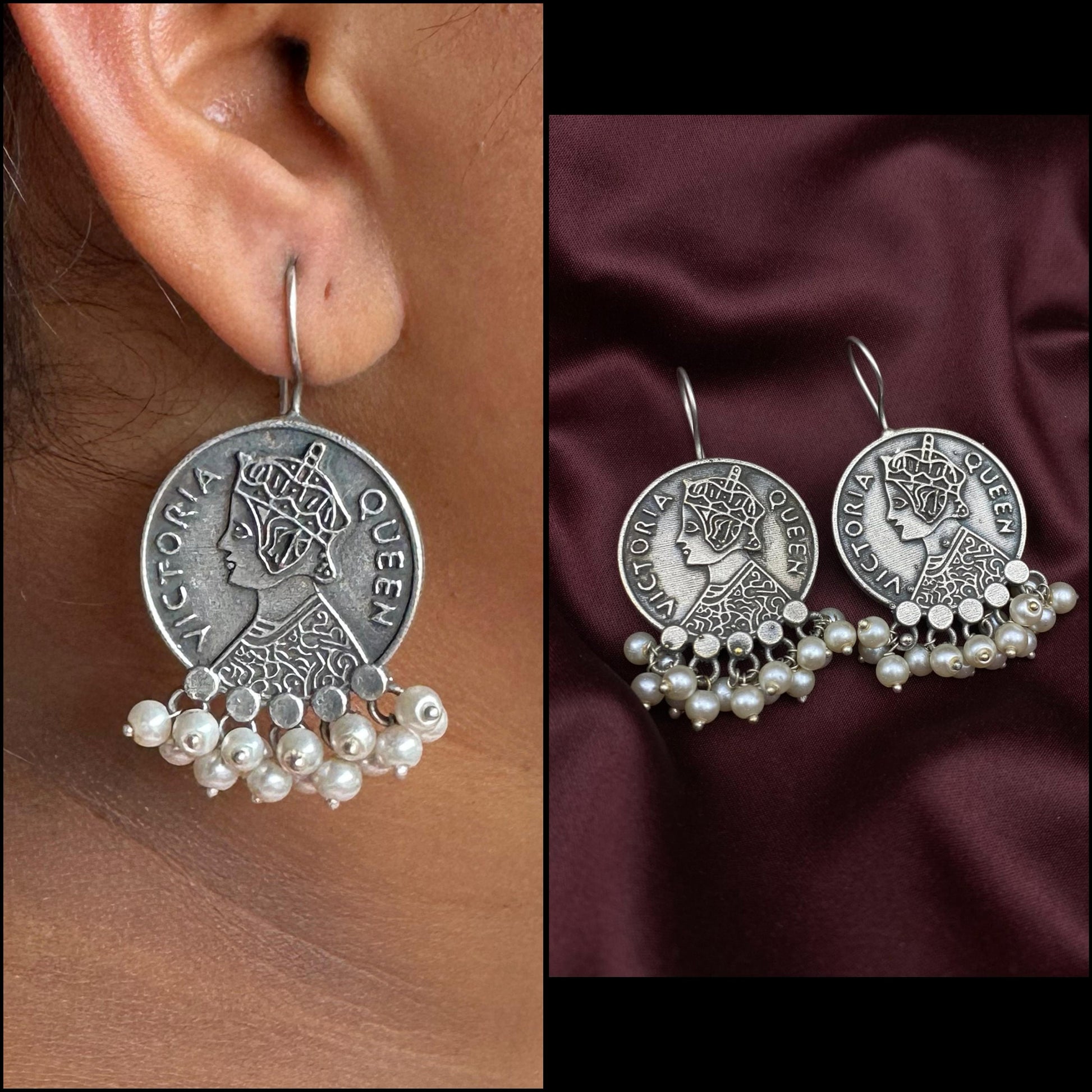 Queen Victoria Silver Oxidised Earrings Indian Jewellery Pearl Hanging Tribal Ethnic Boho Style Quirky Fashions