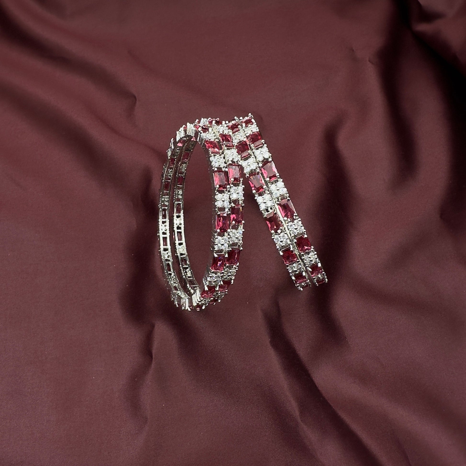 Elevate your style with this exquisite bangle set by Quirky Fashions, featuring premium American Diamond CZ stones arranged in a stunning design. The shimmering stones are paired with a sleek rhodium-plated finish, giving these bangles a luxurious and timeless appeal.
