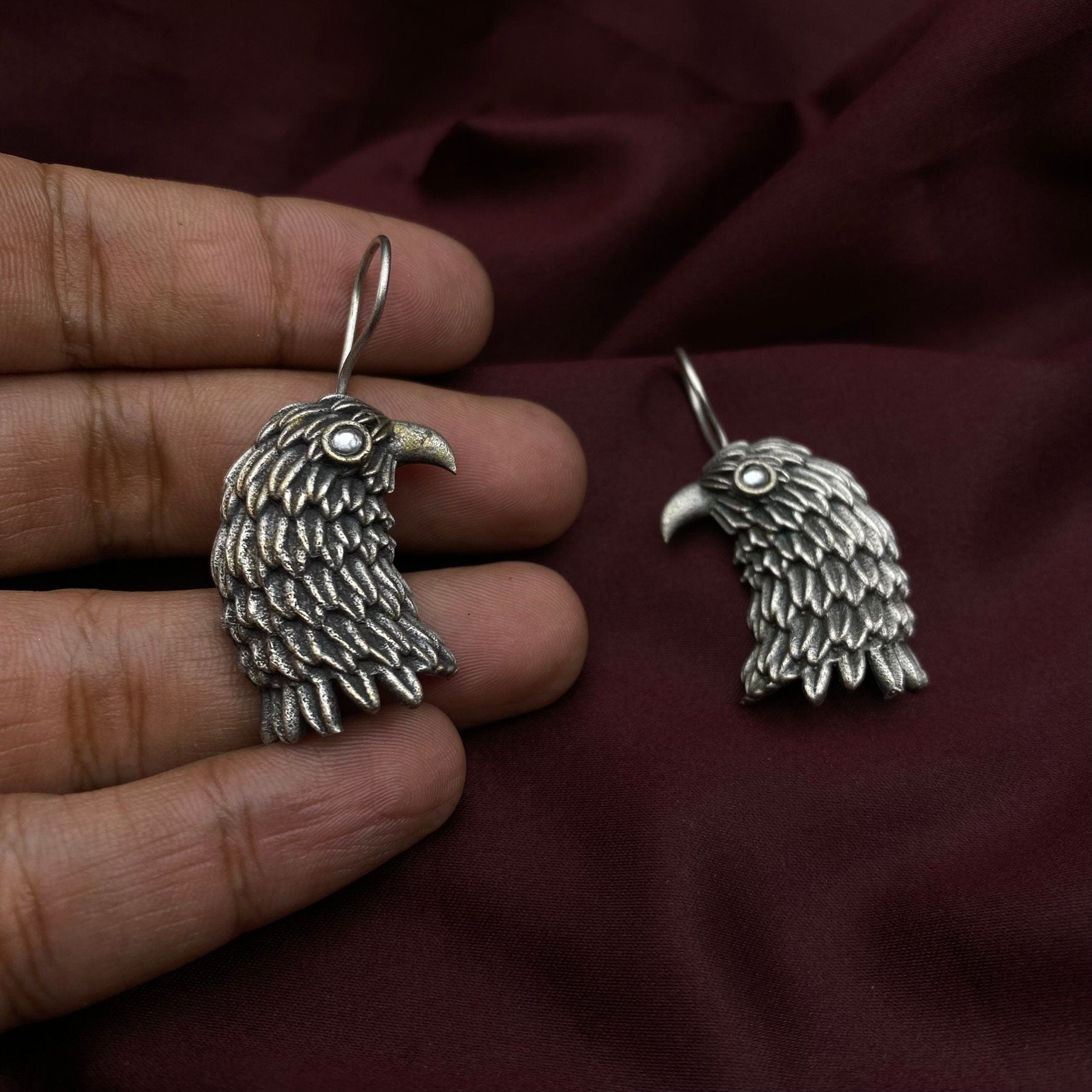 Elevate your style with these unique handcrafted eagle head earrings, designed to make a bold statement. These earrings feature an intricately detailed eagle head motif, meticulously crafted from oxidized silver-tone metal to create a vintage-inspired look. The fine detailing of the feathers and the striking eye give these earrings an exquisite and lifelike appearance.