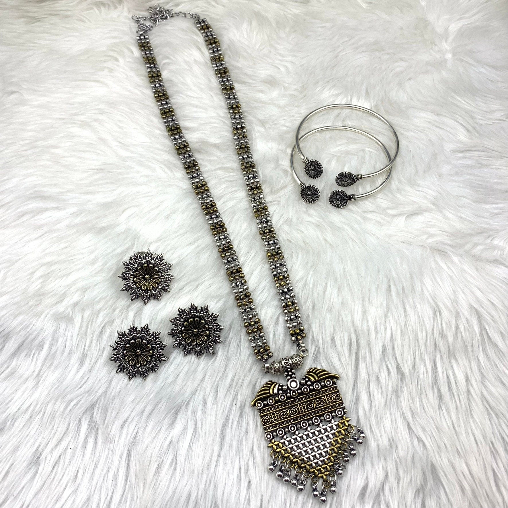 Quirky Fashions Dual tone Oxidized German silver necklace combo set with stud earrings, rings, and bracelets, Indian style jewelry valentine