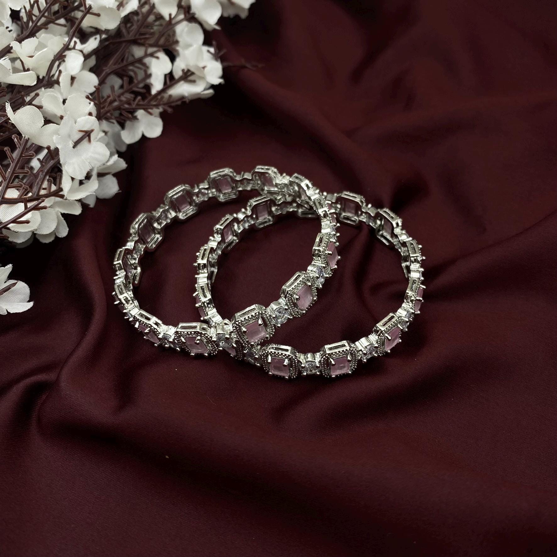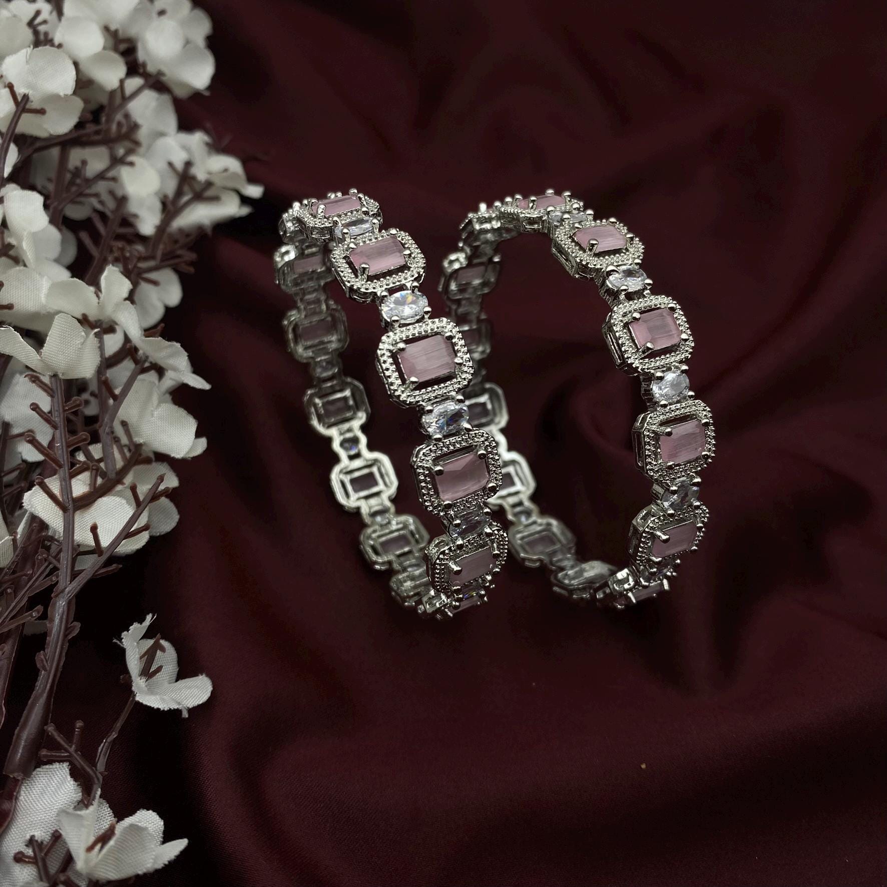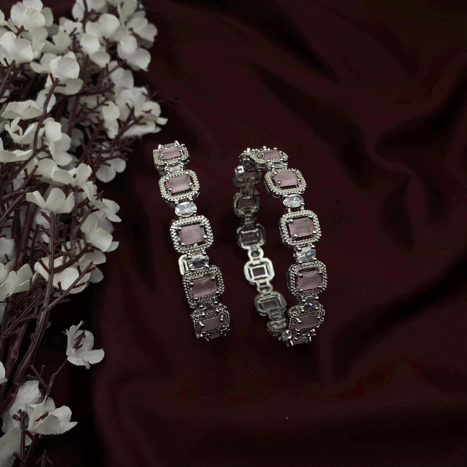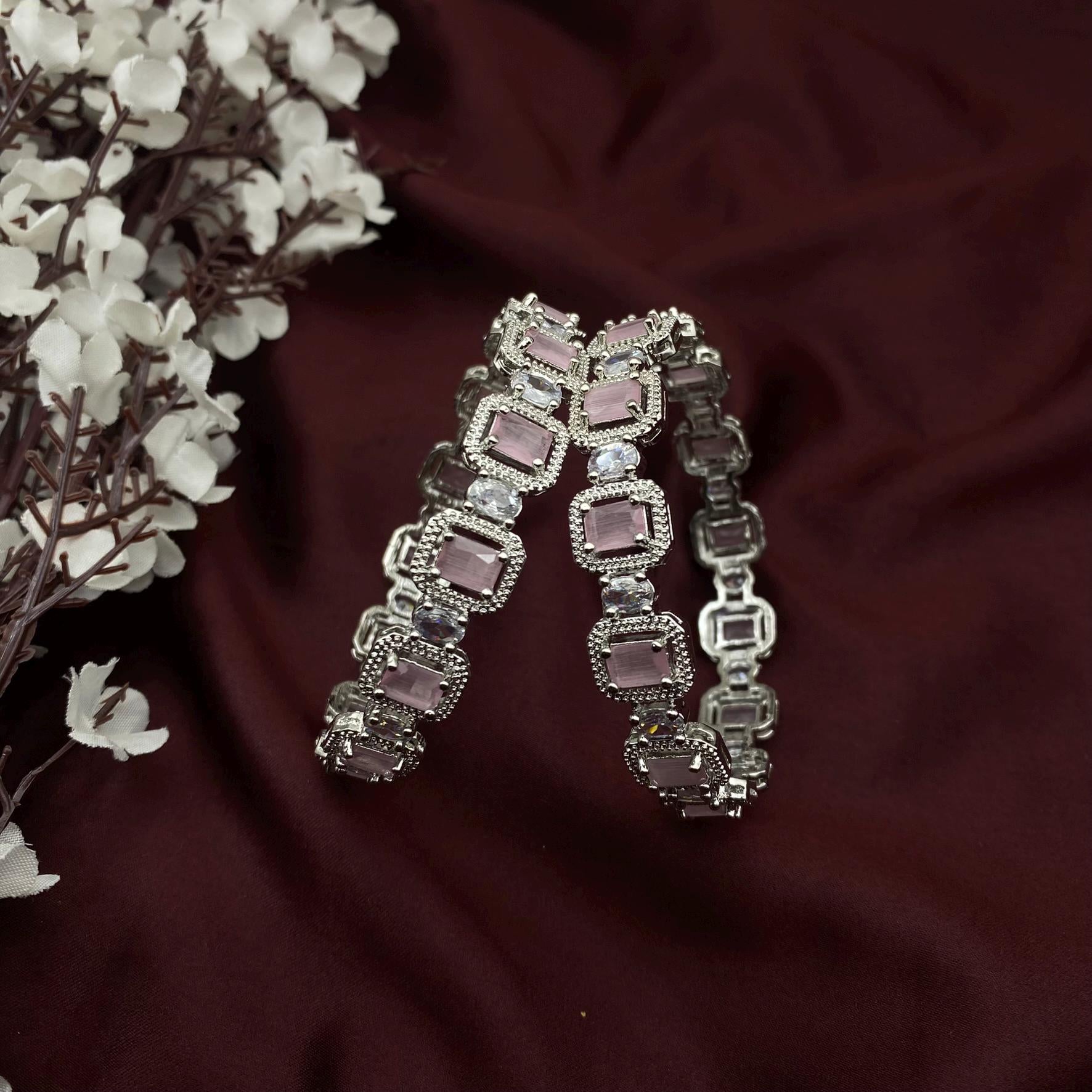 Quirky Fashions presents these elegant bangle pairs Size 2.6, featuring a captivating combination of baby Pink and emerald stone-shaped accents. Each round bangle is meticulously crafted to showcase the vibrant colors and intricate details, making them the perfect addition to any ensemble. Whether worn individually or stacked, these bangles exude a sense of sophistication and unique style.
