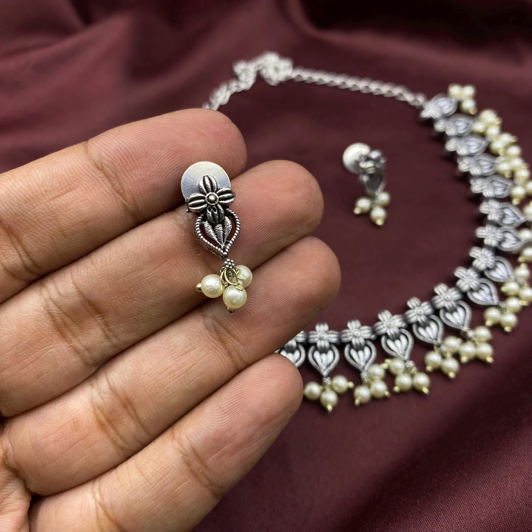 Quirky Fashions Oxidised Choker necklace floral Elegance Pearl Moti Choker Necklace Set with Matching Stud Earrings