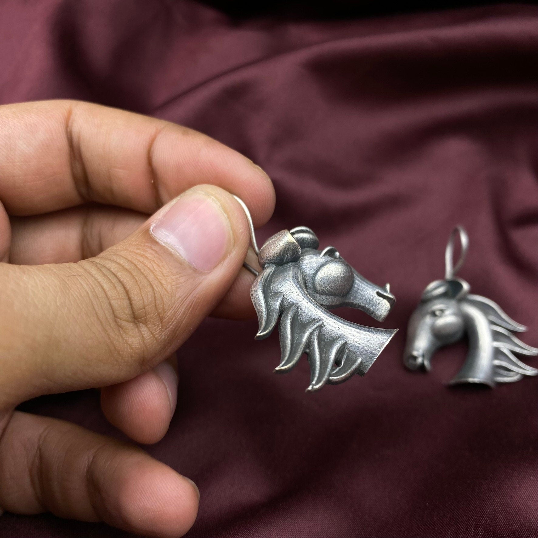Made from high-quality brass and polished in a striking silver oxidized black finish, this earring features a detailed horse face charm that brings the spirit of the horse to life. The horse is depicted with a joyful smile, symbolizing freedom and the bond between horse and rider. The intricate design showcases the horse's mane, skillfully crafted to appear as if it’s flowing in the wind, giving the impression of a horse galloping at full speed.