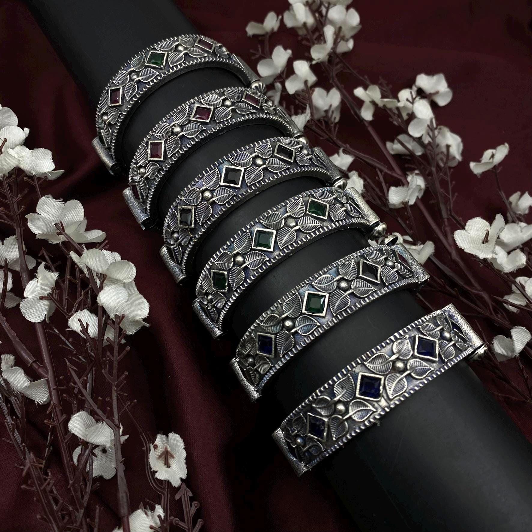 Add a timeless touch to your ethnic look with these intricately crafted oxidized silver bangles by Quirky Fashions. Featuring a floral leaf design and square-cut stones, these bangles are available in four rich stone colors: Red, Green, Blue, and Black. Sold as a pair in the color of your choice, each bangle is designed with a bold tribal aesthetic and antique finish. Perfect for festive occasions, gifting, or daily ethnic wear.