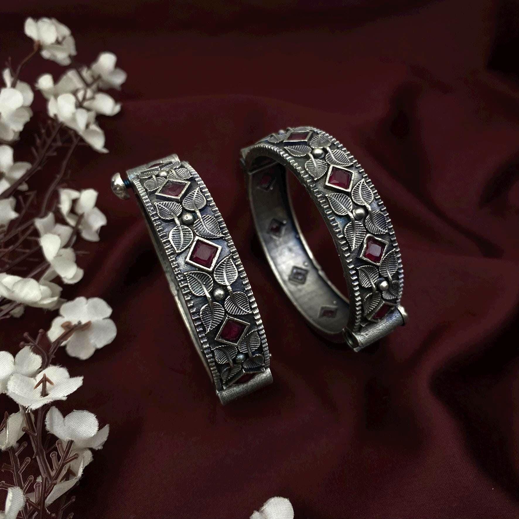 Quirky Fashions Oxidized Silver Bangles with Floral Carving – Traditional Pair in Red, Green, Blue, or Black Stone
