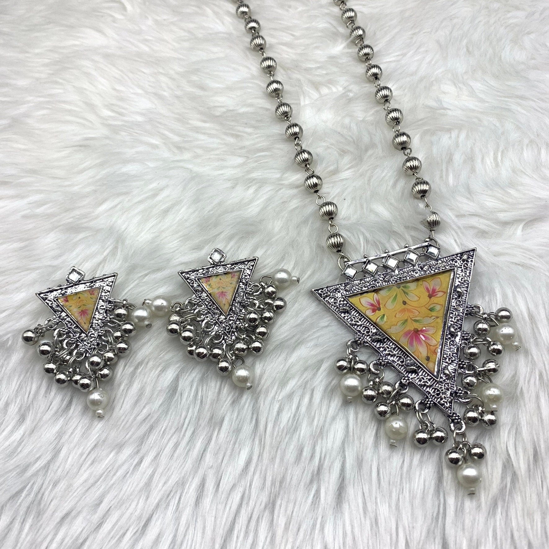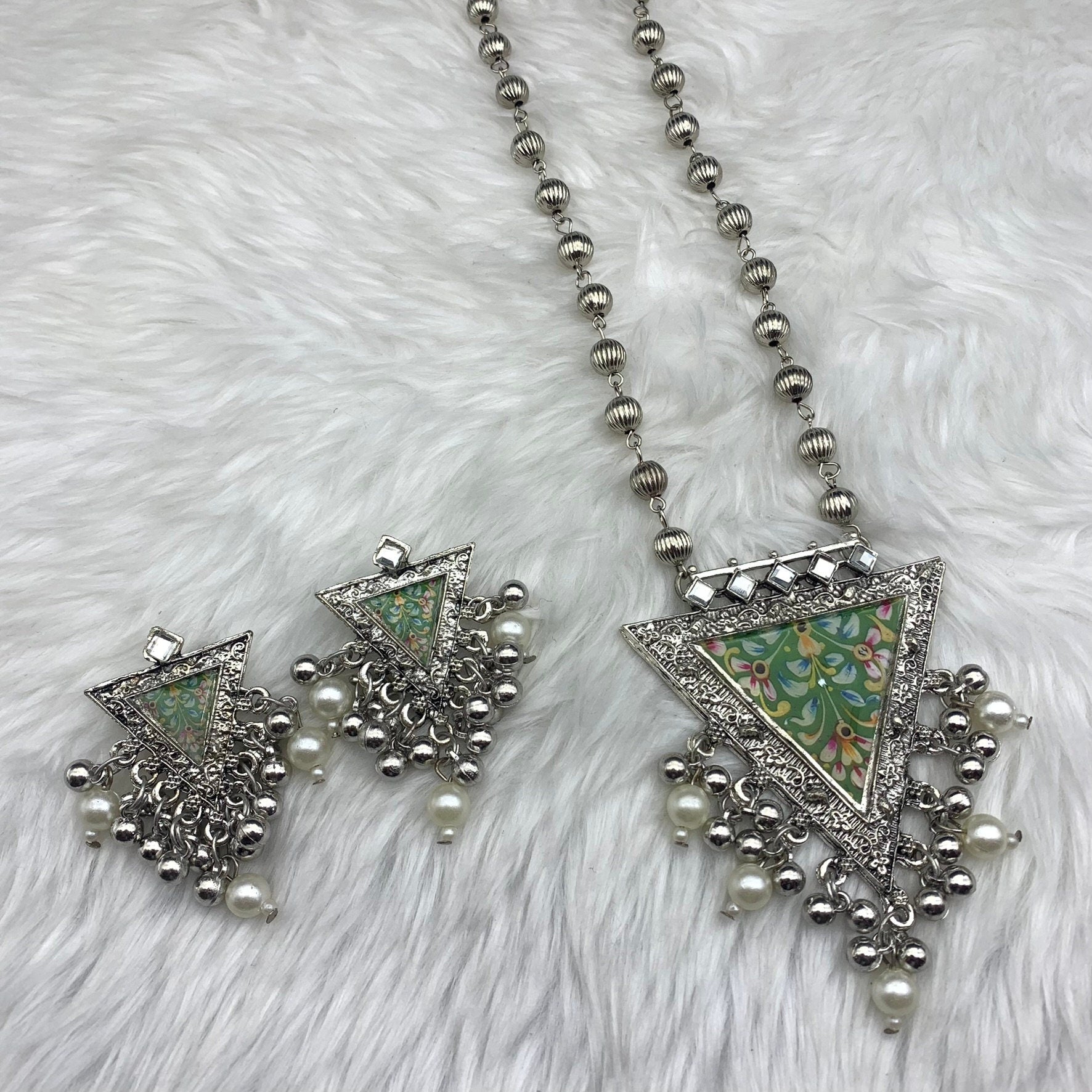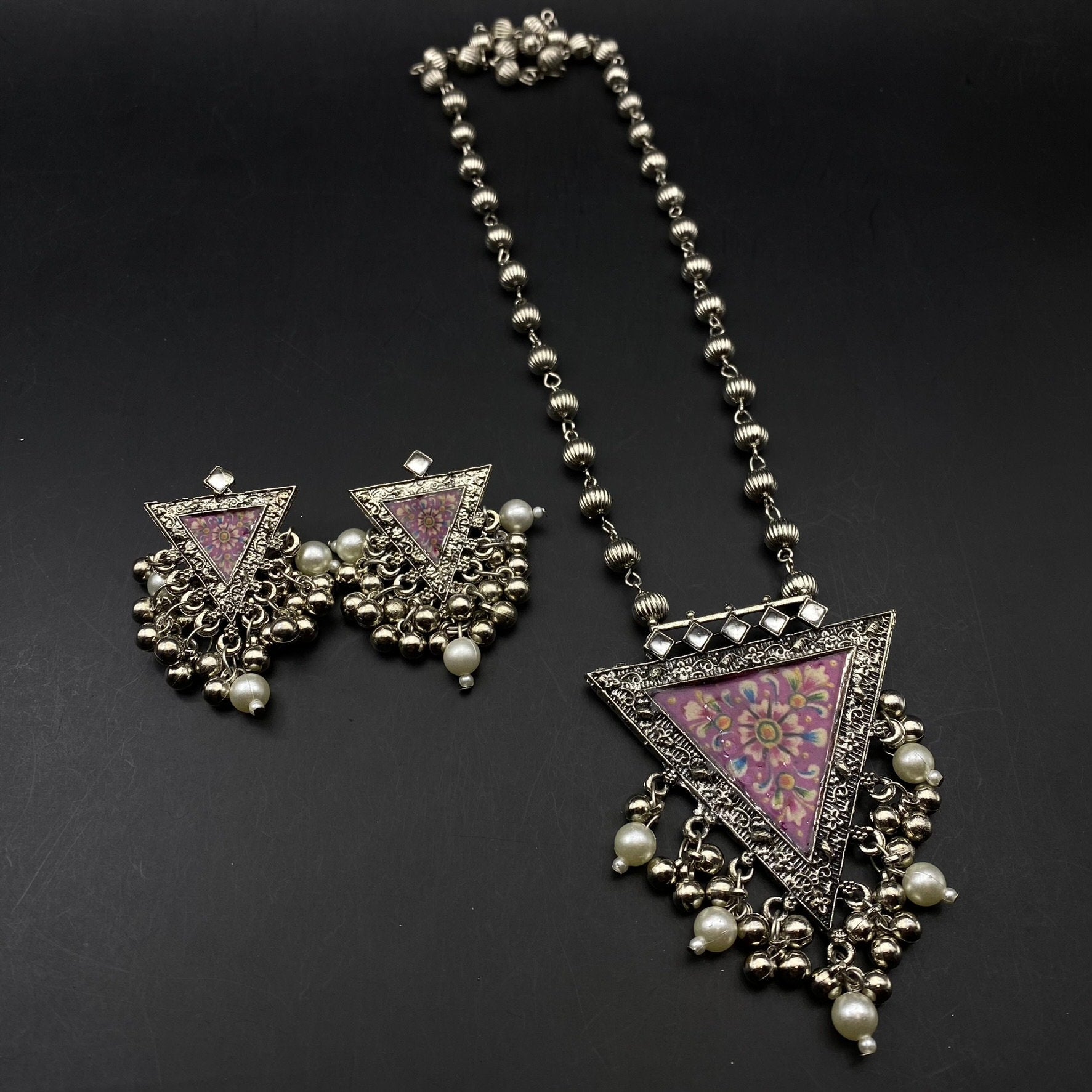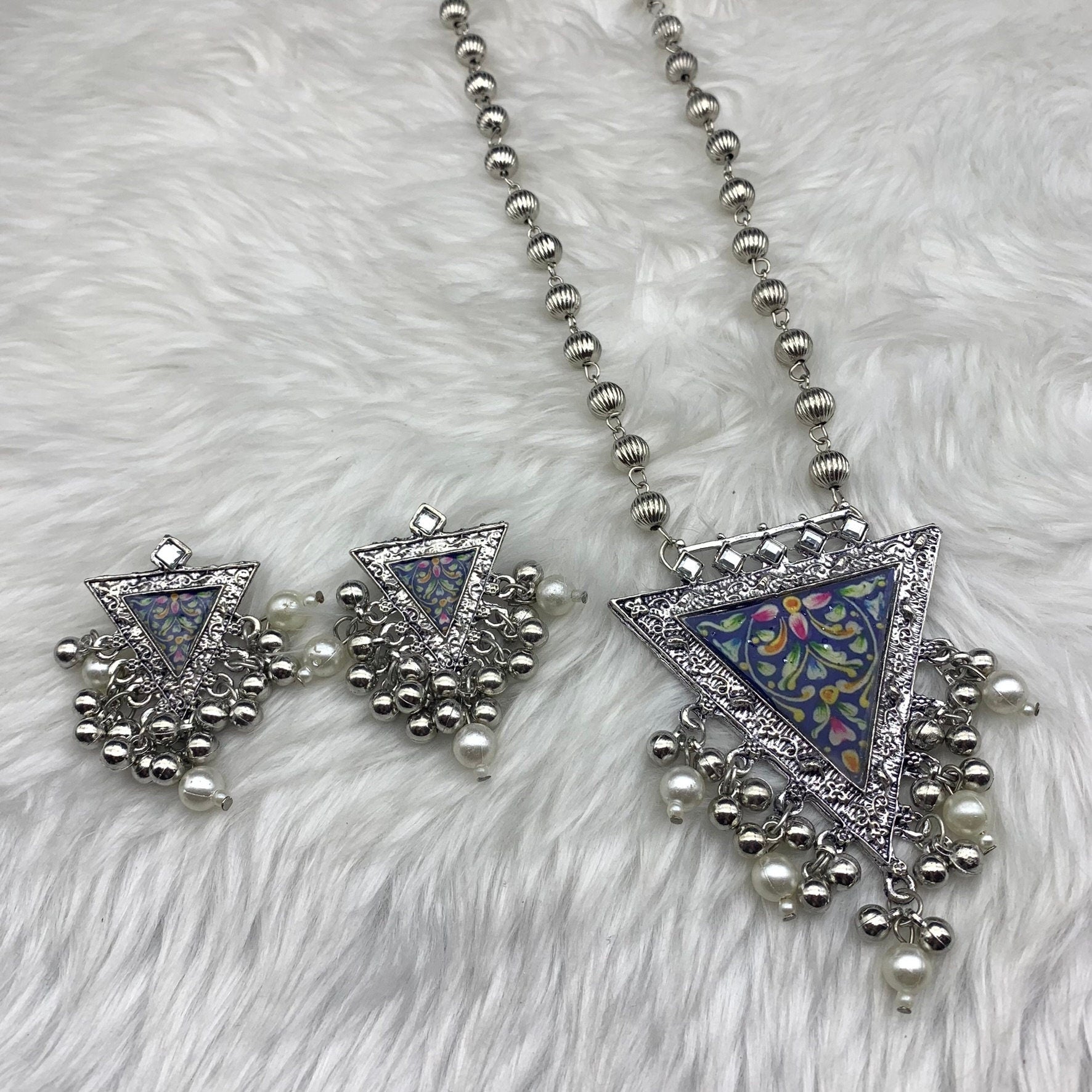 Quirky Fashions Oxidized silver Indian style ethnic wear jewelry necklace set with earrings, banjara necklace, handmade pumpkin beads chain.
