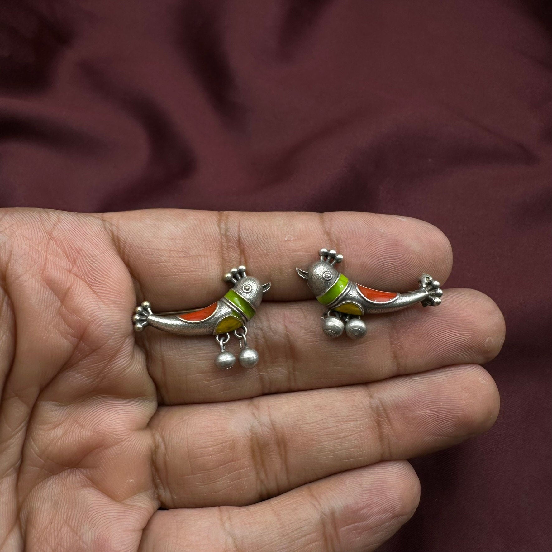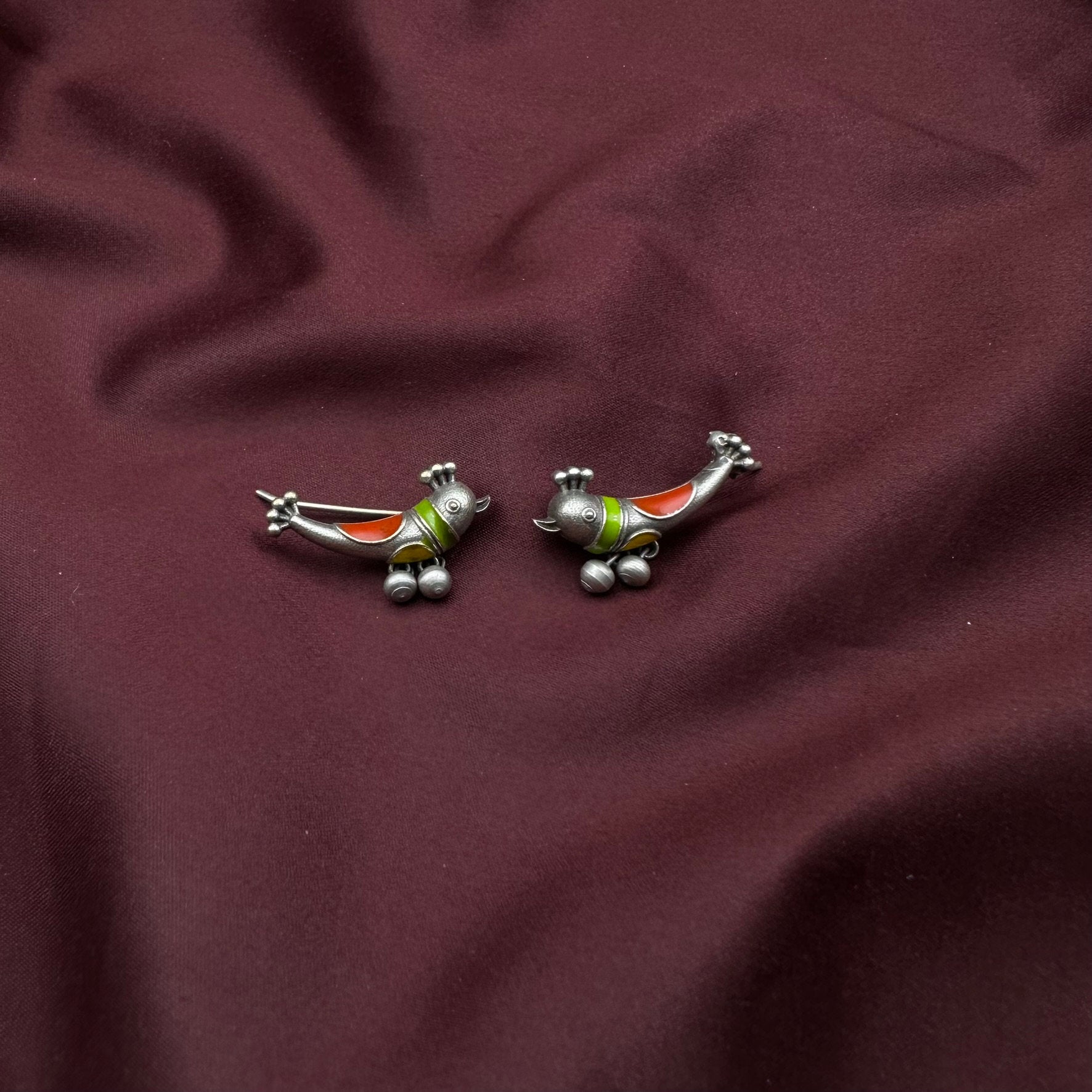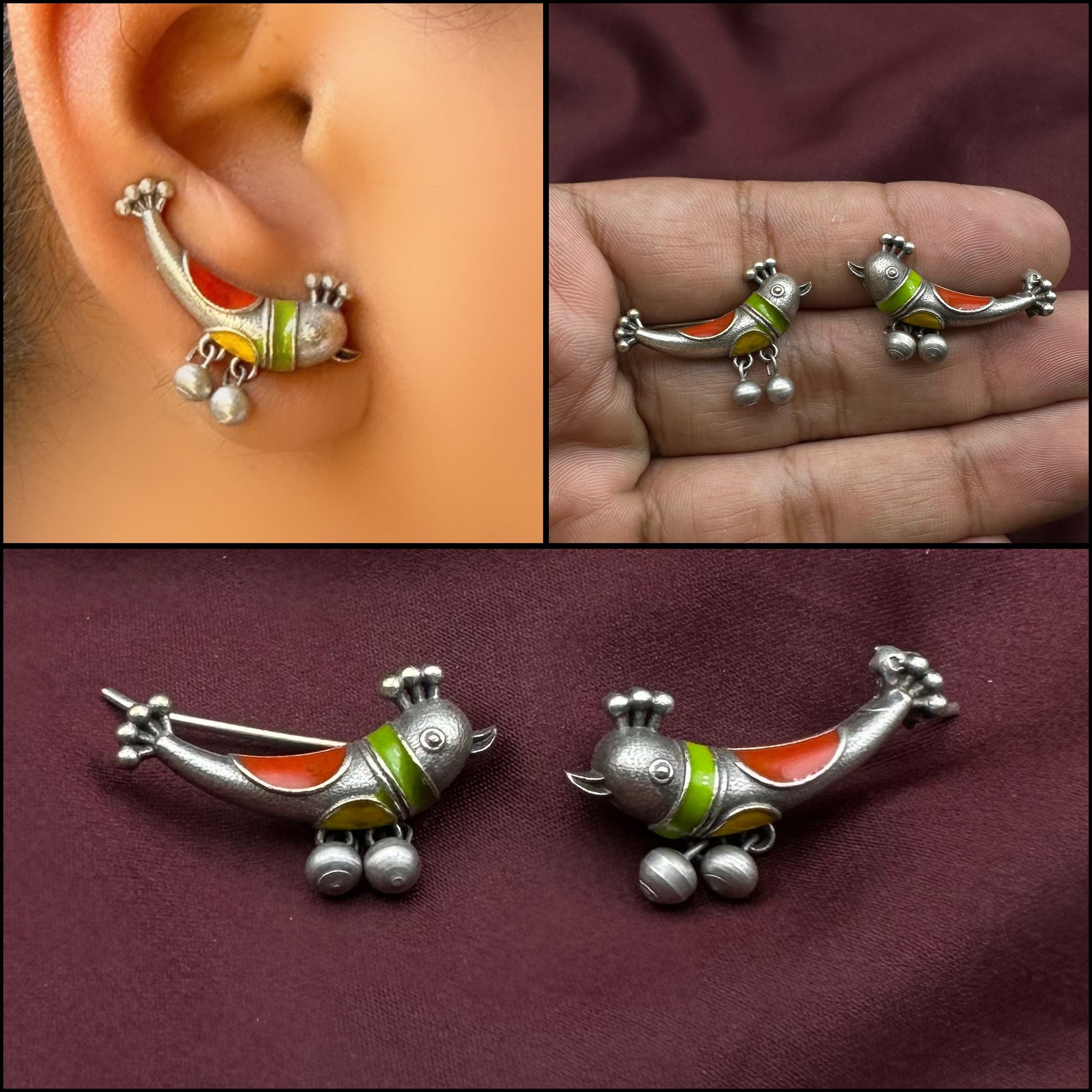 Silver Enamelled Ear Crawlers with Bird motif inspired from Designer Paintings. Crafted in Oxidised Silver. Uniquely handcrafted, no two pieces are exactly alike!