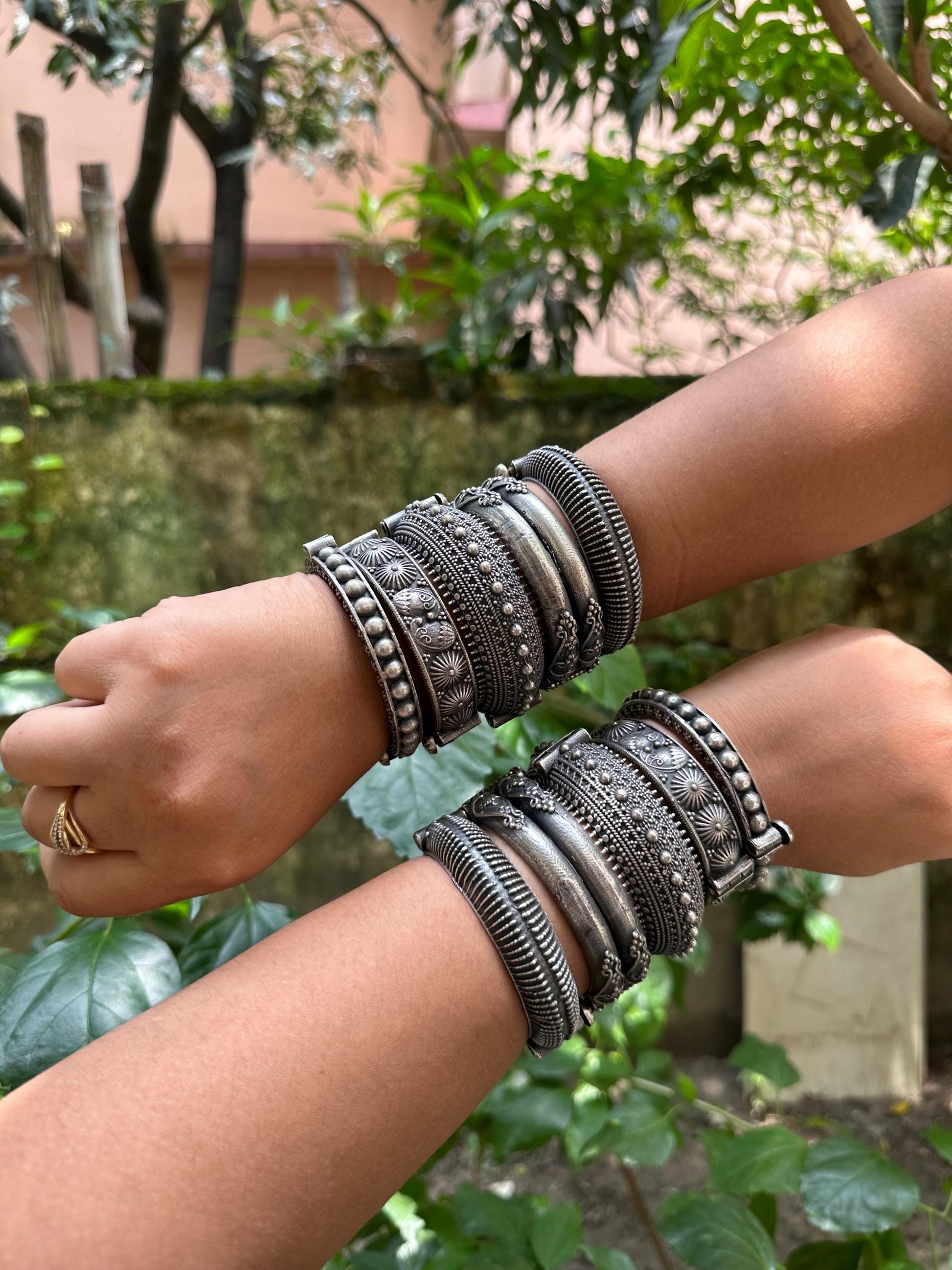 Introducing the Premium Silver Replica Kada Bangle Set by Quirky Fashions, an exquisite collection of 5 ethnic wear bangles with a striking black polish finish. Crafted from high-quality brass metal, each bangle showcases a unique design that blends traditional elegance with a boho-chic flair.
