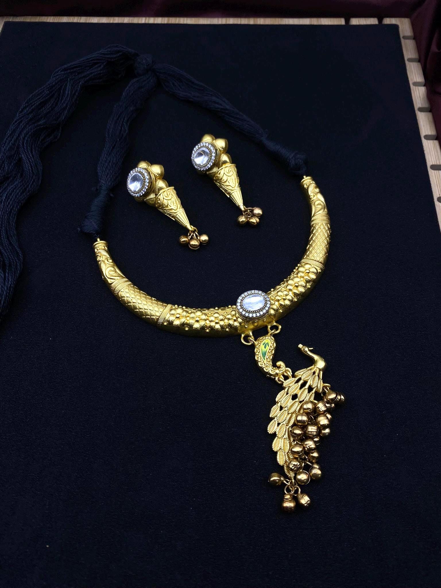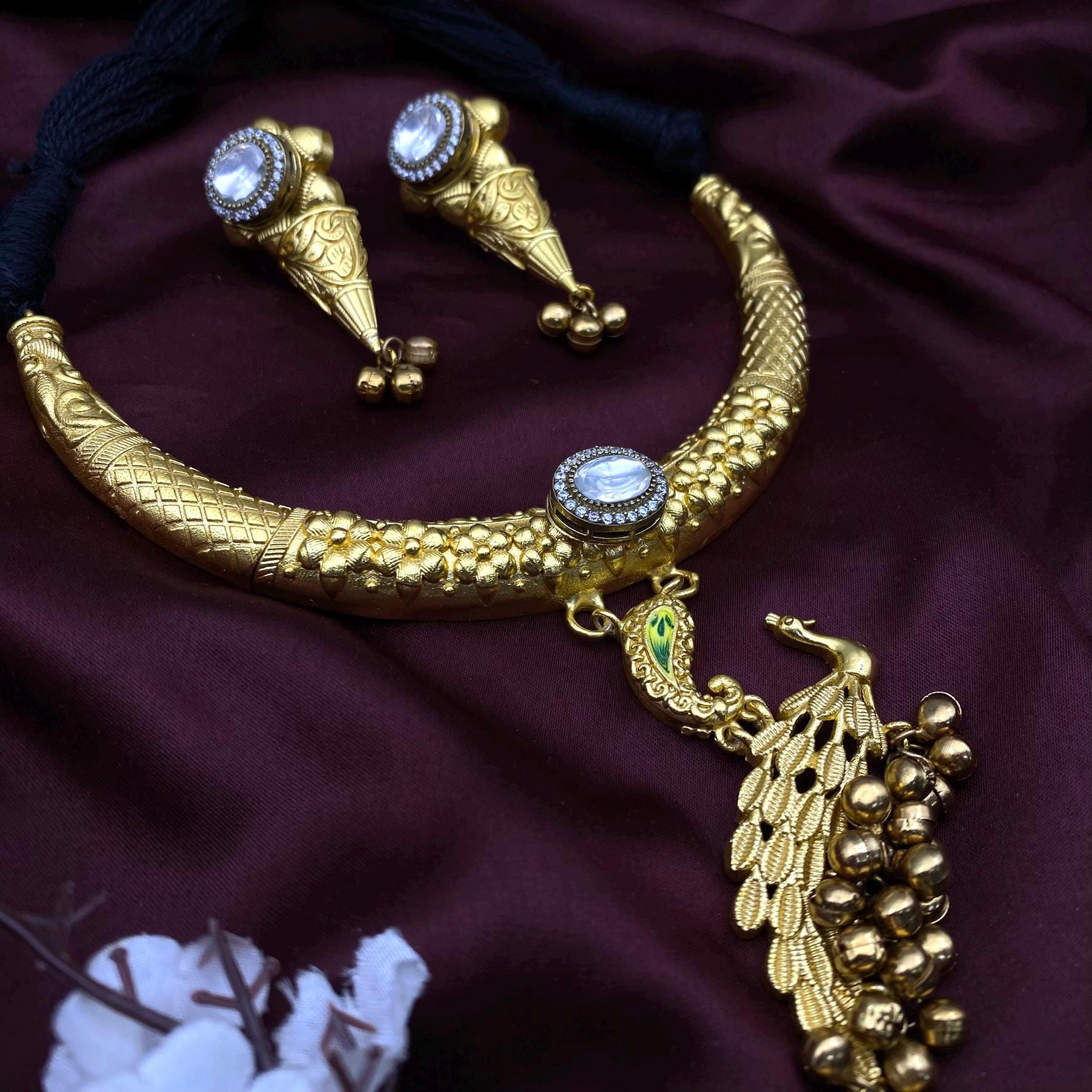 Bring timeless elegance to your traditional look with this handcrafted South Indian temple jewelry set by Quirky Fashions. This statement hasli necklace features a bold crescent design in antique gold tone, accented with intricate detailing and a stunning peacock pendant with jingle ghungroos. A white kundan-style stone sits at the center, adding a regal touch. The set comes complete with matching long drop earrings that echo the ornate motifs of the necklace.