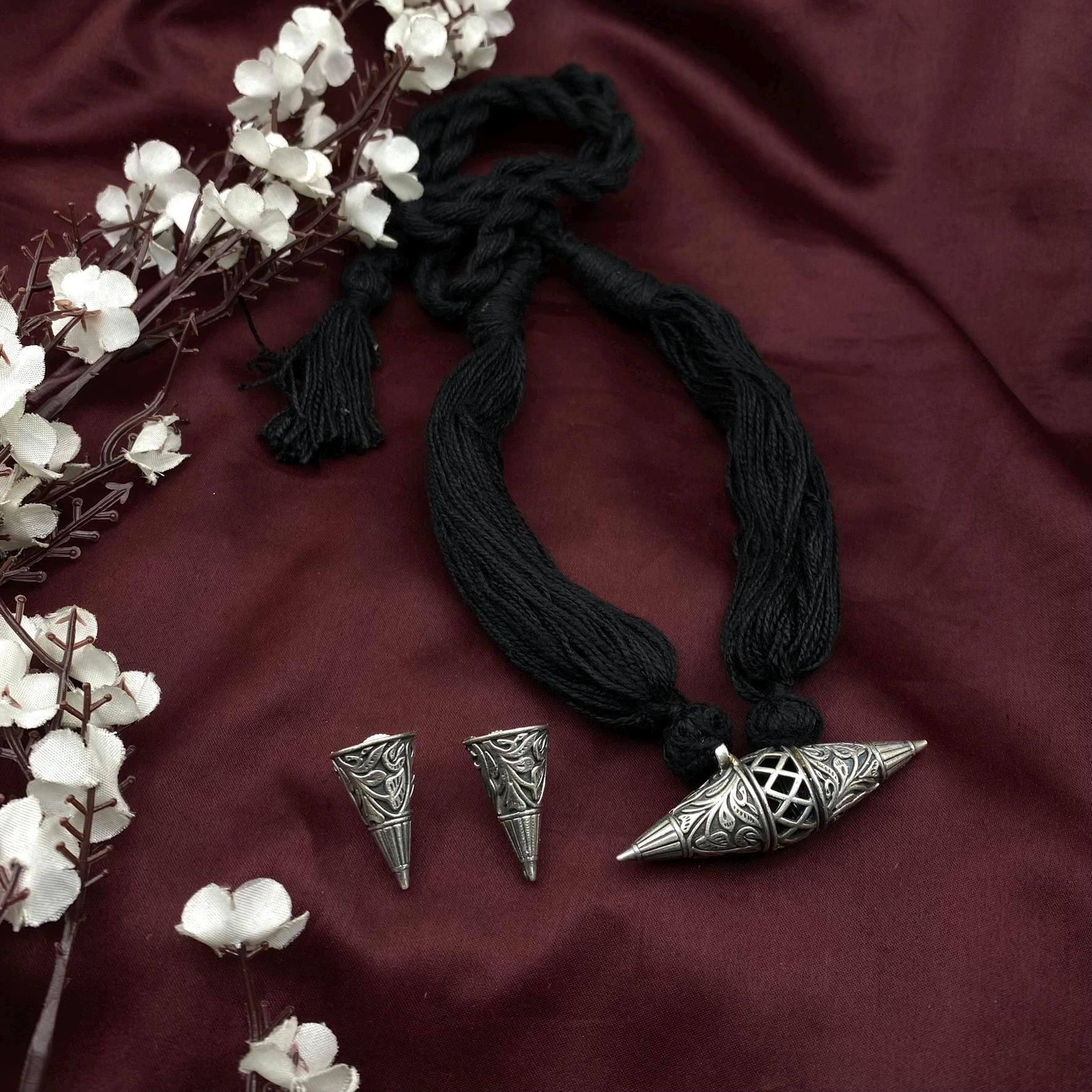 Tribal Cone Pendant Necklace Set with Earrings – Black Thread Oxidized Silver Jewelry by Quirky Fashions